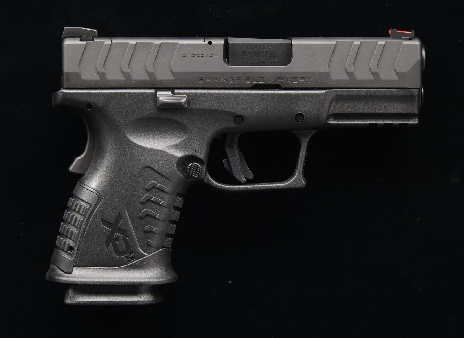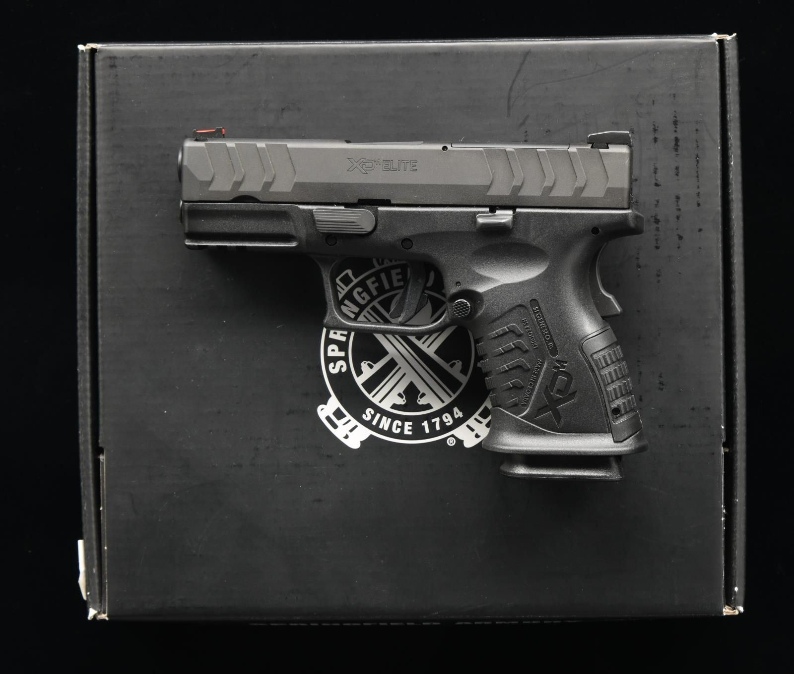 Cal. 10mm. S# BA535734. Bbl. 3 3/4". Fiber optic front sight. White outline U-notch rear sight. Slide has factory cut for RMR plate for reflex sight mounting. Matte black finish. Polymer frame w/ accessory rail. MAGS: 2-10 rd. UNATTACHED ACCESSORIES: matching numbered factory box w/ softcase, two grip straps, two spare mag baseplate, manual, cable lock & paperwork. CONDITION: all aspects near new in the box. PROVENANCE: The Collection of Gun Sport Ltd owned by Jon R. Thomas. (23-4058/MJC). MODERN. $300-500.
