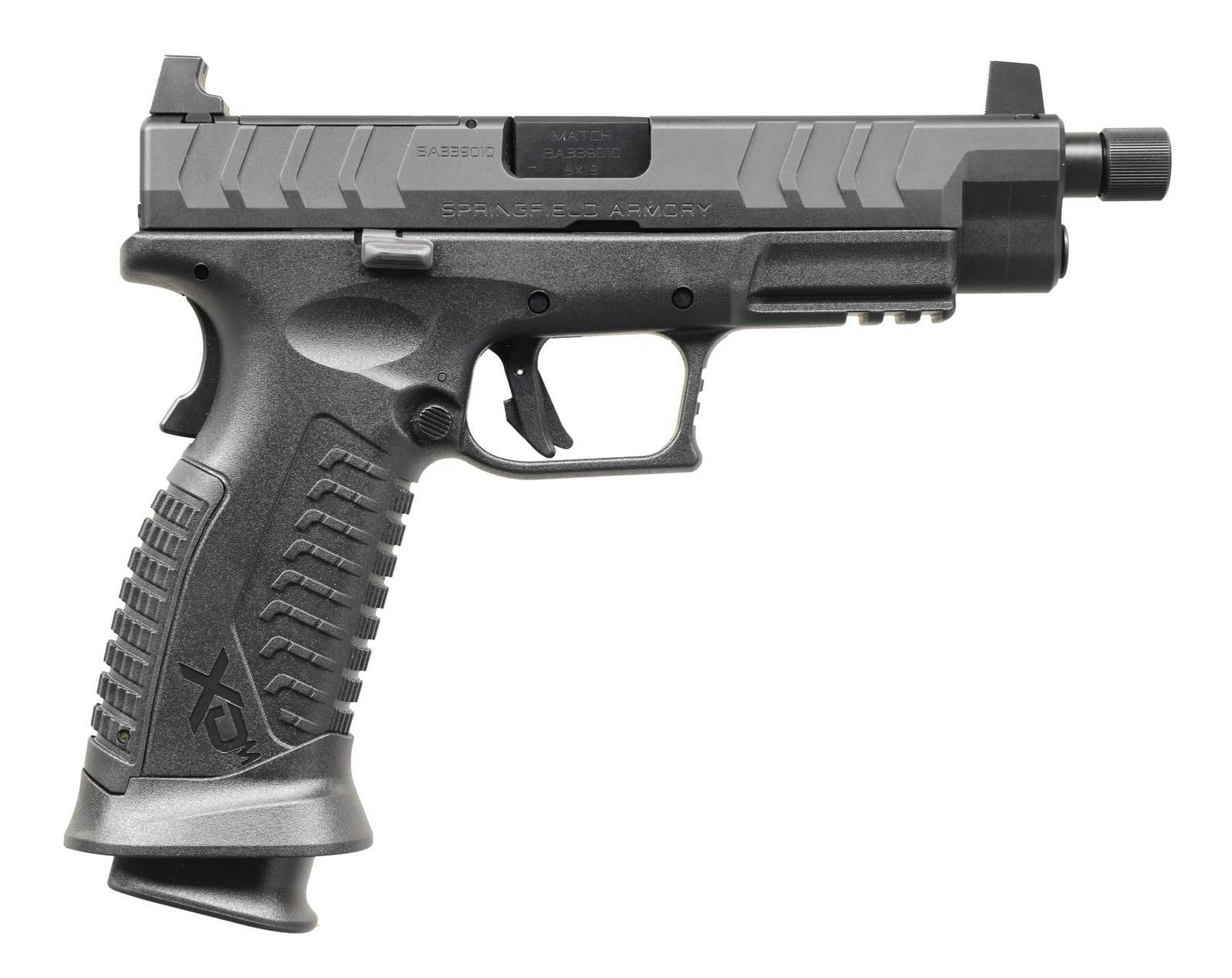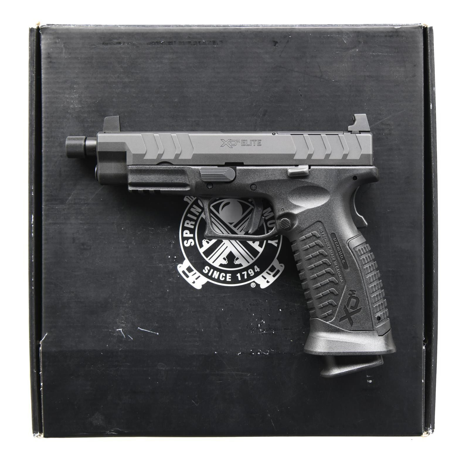 Cal. 9mm Luger. S# BA339010. Bbl. 4 1/2", threaded w/ thread protector. Black blade front sight. Black square notch rear sight. Slide has factory cut for RMR plate for reflex sight mounting. Matte black finish. Polymer frame w/ accessory rail. MAGS: 2-19 rd. UNATTACHED ACCESSORIES: matching numbered factory box w/ softcase, cable lock, manual, paperwork, two grip straps, & two mag baseplates. CONDITION: all aspects near new, in the box. PROVENANCE: the Collection of Gun Sport Ltd owned by Jon R. Thomas. (23-2992/MJC). MODERN. $400-600.