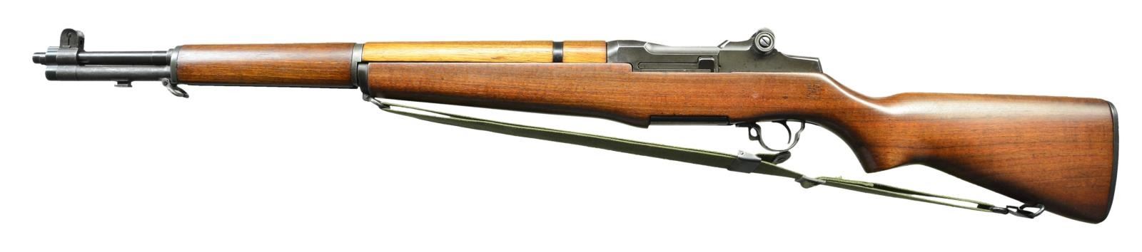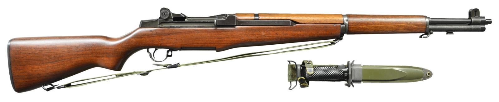 Cal. 30-06. S #5369387. Bbl. 24" w/ Springfield markings, 8-54 date and import marking. Throat gauges 1.0 Muzzle gauges 1.0. Proper "-65 SA" op rod, trigger housing & bolt. Other small parts SA marked or unmarked w/ various drawing numbers. Adjustable aperture rear sight. Blade front sight w/ protective ears. Stamped triggerguard. Walnut stock w/ "DoD eagle" cartouche on left side & circled P on bottom of wrist. Rear handguard is lighter in color than rest of stock set. Green canvas GI style sling. UNATTACHED ACCESSORIES: green plastic rear sight cover, M5A1 bayonet, canvas frog & M8A1 scabbard. Crossguard is maker marked by Imperial. Metal parts of bayonet show moderate silvering. Grip panels show light wear. Scabbard is maker marked by TWB. Scabbard shows moderate wear. CONDITION: refinished walnut stock set has small filler repair on underside & some handling marks. Metal retains 70% light gray arsenal parkerized finish w/ scattered silvering & thinning. Very good bore w/ some light frosting towards muzzle. (22-2549/MJC). CURIO. $500-800.