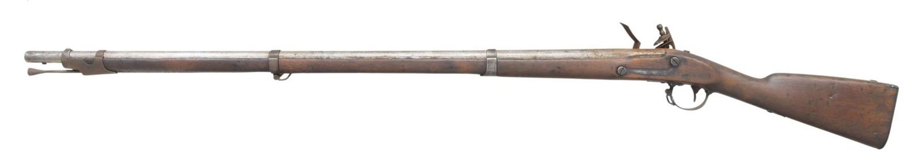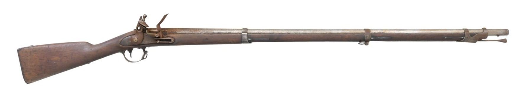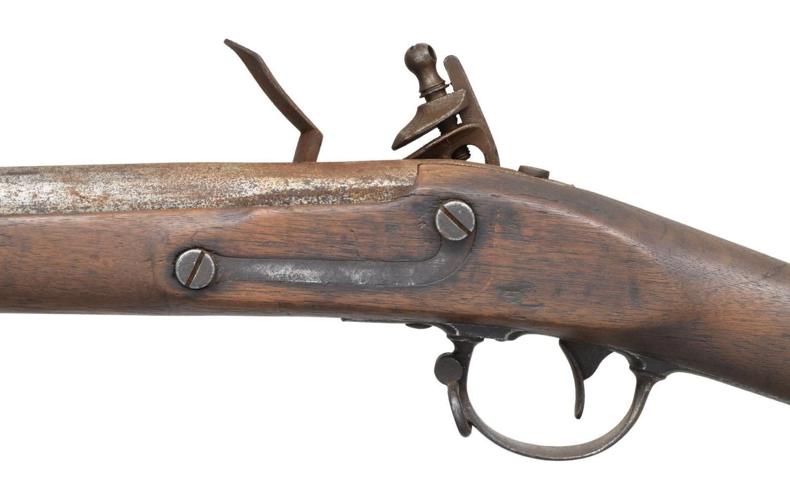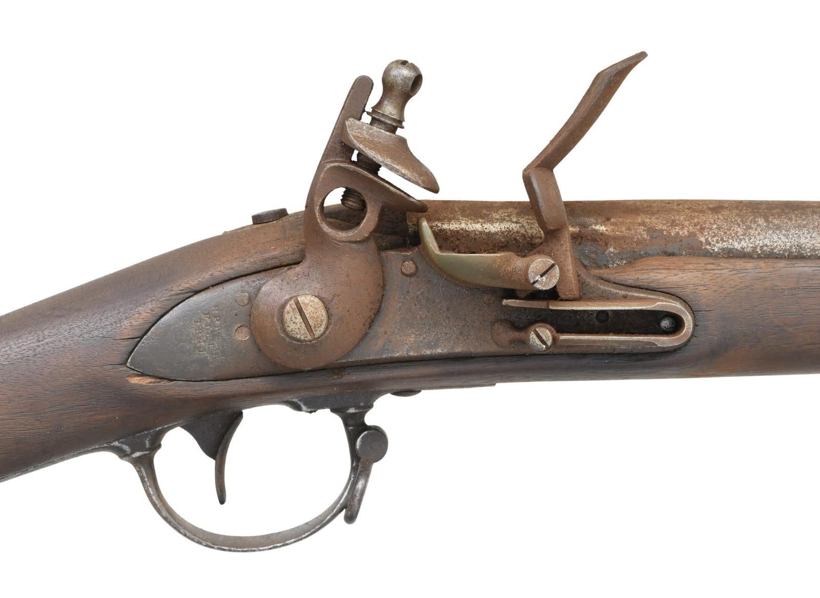 MUSKET. Cal. 69. NSN. Bbl. 42" round. Bbl. band mounted brass blade front sight. Springfield marked lock is dated 1841. 3 band walnut stock w/ iron fittings & tulip tipped ramrod. CONDITION: white finished bbl. shows light pitting becoming heavy in breech area w/ areas of red surface corrosion. Lock shows light red corrosion. Sanded stock has age darkened worn appearance w/ numerous dents having small chips & cracks around tang & sideplate areas. Right side around lock shows heavy erosion. Functioning lock. Lightly pitted bore. (01-24647/DS). ANTIQUE. $800-1,200.