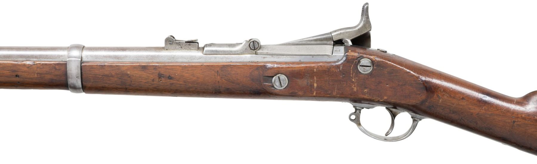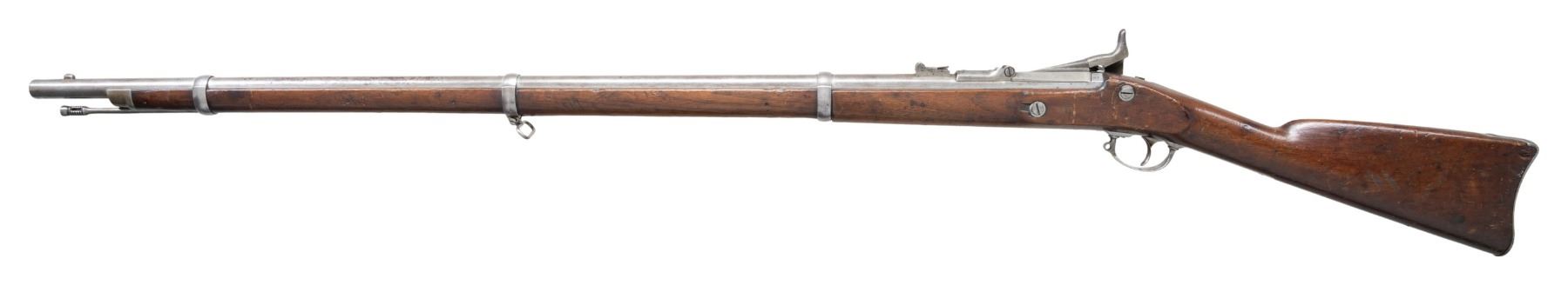 CONVERSION SINGLE SHOT RIFLE. Cal. 50-70. NSN. Bbl. 36 5/8" round. Fixed front with folding leaf rear sight. 1866 dated breech block. Springfield 1864 dated lock. 3 band fastened walnut stock has iron fittings & slotted tip iron ramrod. Designed by Erskine S. Allin, a total of 25,000 were converted from model 1863 percussion muskets in 1866. CONDITION: metal has a faded gray appearaance showing scattered light corrosion. Sanded & refinished stock shows dents & marks. Sound action. Generally bright bore has strong rifling. (01-27409/DS). ANTIQUE. $500-800.