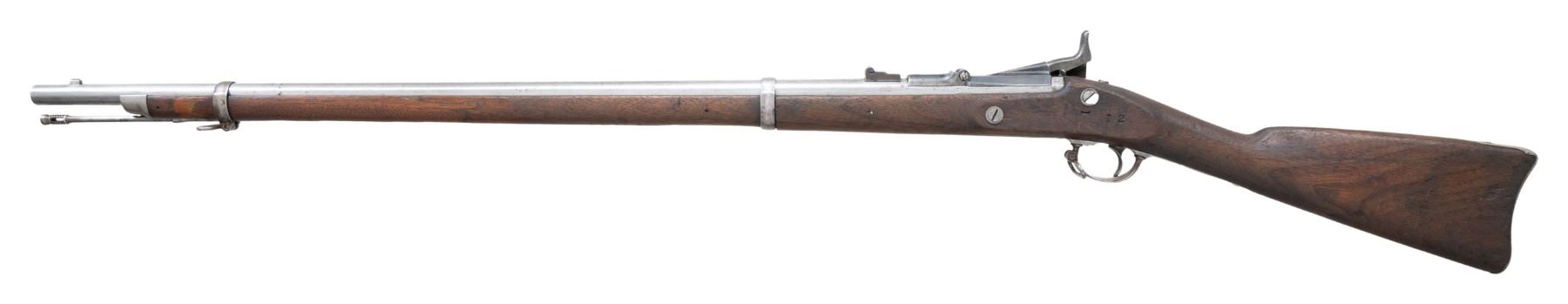 CONVERSION TRAPDOOR RIFLE. Cal. 50-70. NSN. Bbl. 32 5/8" marked "X" on left side of chamber area. Fixed front sight with folding leaf rear sight. "1866" dated breechblock on screw attached base. "1865" dated Springfield lockplate. Slotted tip iron ramrod. 2-band fastened walnut stock with iron buttplate and fittings. Left ear of stock is stamped with a horizontal "1", followed by a "12". CONDITION: in-the-white bbl. finish shows scattered dark tarnish and small spots of corrosion. Action and lock retain 40% dull fading blue. Stock has heavily worn appearance with dents, scratches, and marks. Sound mechanics. Pitted bore retains intact rifling. PROVENANCE: Estate Collection of Nicholas Apergis. (01-27463/DS). ANTIQUE. $700-1,000.