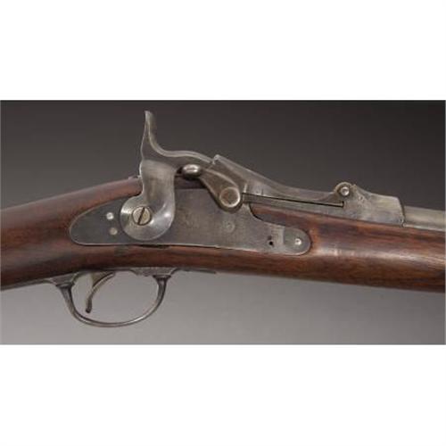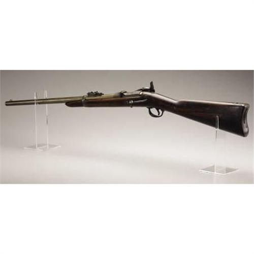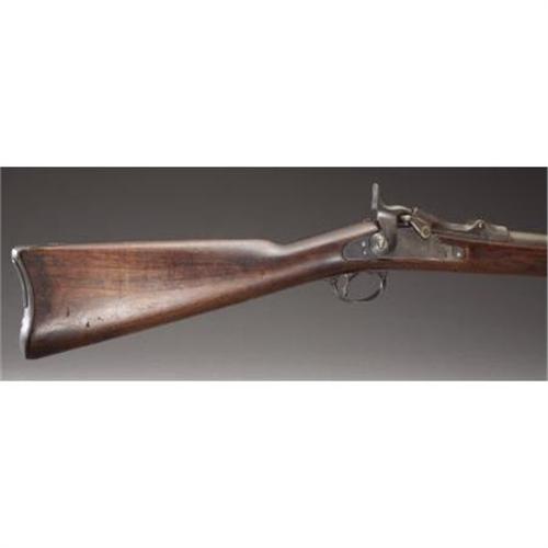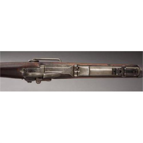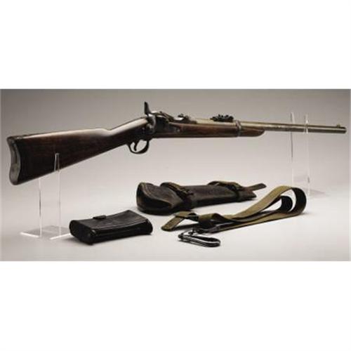 <B>SPRINGFIELD MODEL 1873 CARBINE WITH ACCESSORIES</B></I> Serial number 31952, circa 1875-6. 22” barrel in .45-70 calibre. Barrel, receiver, lock plate, thumb latch, two notch tumbler and trigger guard are components as standard for 1st Model Trapdoor carbines. Upgraded components for carbines that took place in the late 1870's and afterwards are evident on this specimen, i.e., breachblock, hammer, trigger, rear sight, barrel band and stock. 1887 and circle 'P' cartouches are barely visible on stock. Cleaning rods are still in the butt.<BR>Accompanying this lot are a group of vintage accessories: Model 1887 carbine boot, Dyer .45-70 cartridge box with embossed 'U.S.' and Indian Wars vintage carbine sling.<BR><BR><B>Condition:</B></I> Carbine finish covers a range of condition from original blue on the trigger guard to cleaning on the barrel, creating a light grey coloration. Lock plate has three added holes, two of which are plugged. Grind marks are evident on front portion of lock plate yet good blue shows on tail. One sight screw and one butt plate screw are missing. Stock has been lightly cleaned with some touch-up stain added. Dyer cartridge box sound with a strong 'U.S' in oval. Internal cartridge loops are sound as well. 1887 Model carbine boot is complete as manufactured. There's a lot of crazing on the body of the boot. It could stand a good treatment of preservative. Carbine sling is complete with swivel and hook. A piece of leather has been sectioned into the sling to bring it to proper length. This is not unusual for an Indian Wars sling and has been encountered on other original examples.<BR><BR><b>Shipping:</b> Bats, Clubs, Sticks, Swords, Rif (<a target="_blank" href="http://www.heritageauctions.com/common/shipping.php">view shipping information</a>)