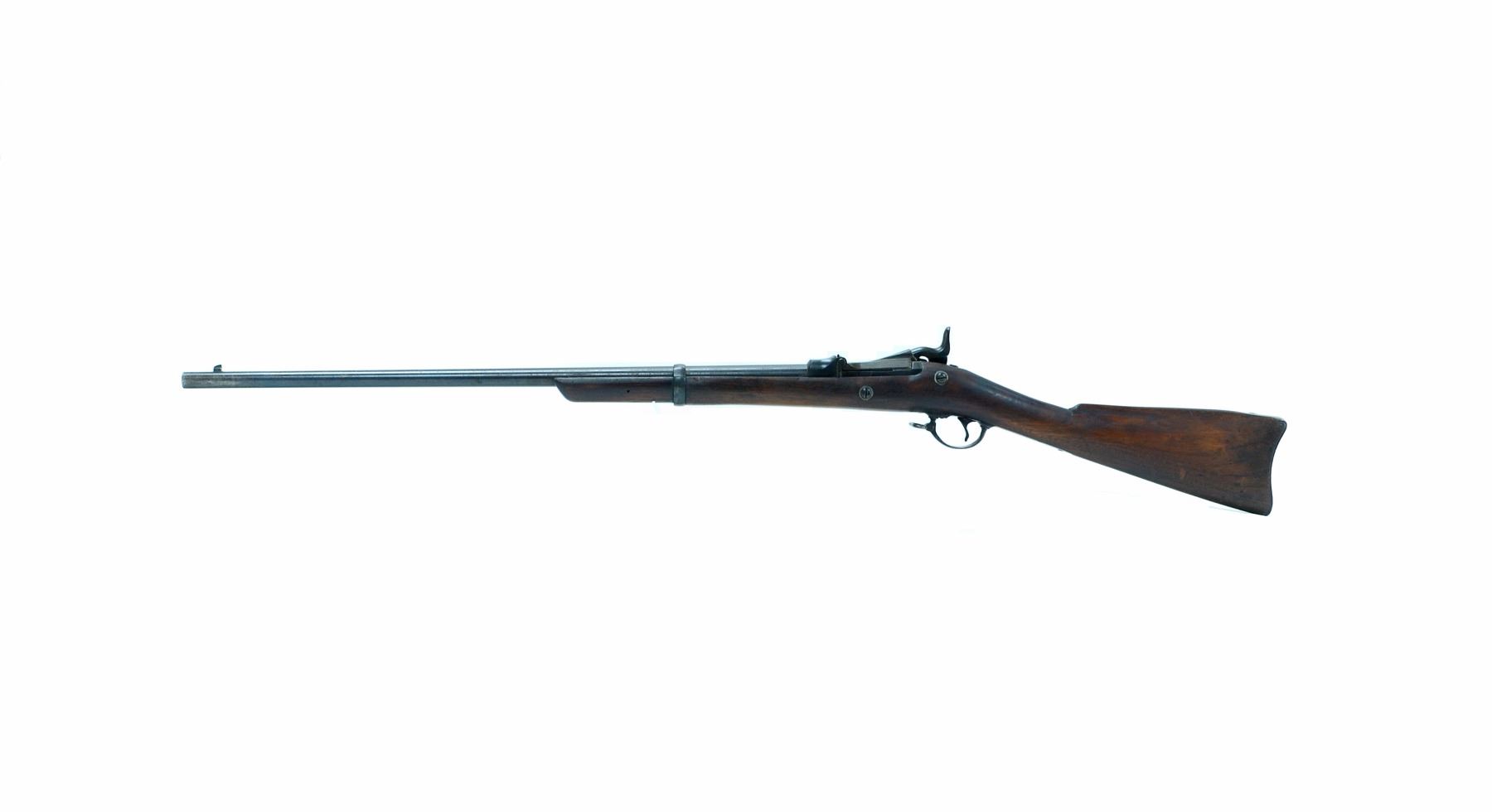 463-051 SPRINGFIELD MODEL 1884 "TRAP DOOR" 45-70 GOV'T SINGLE SHOT, 27" BARREL, FIXED IRON SIGHTS, ORIGINAL STOCK IN GOOD SHAPE, HAS BEEN SPORTERIZED, MISSING "BIFFINGTON" REAR SIGHT, METAL AND BORE GOOD, RIFILING FAINT, MADE IN THE U.S.A.
