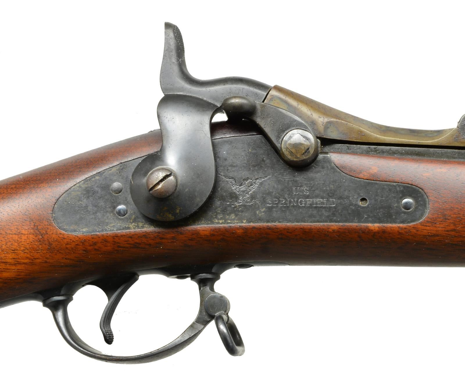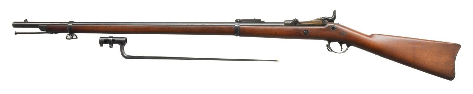 Cal. 45-70. S# 475690. Bbl. 32 5/8". Blade front sight w/ Buffington rear sight. Case colored low arch breech block. Blued Springfield marked lock, hammer & 2 piece trigger guard w/ sling swivel & grooved trigger. 2 Band fastened walnut stock w/ sharp "SWP" 1889 dated cartouche. Toeline of stock has circle "P" firing proof. Slotted tipped iron ramrod. UNATTACHED ACCESSORIES: US marked triangular bayonet. CONDITION: very fine. Bbl. Action & fittings retain over 90% lightly faded blue showing scattered spots of freckling. Breech block has over 90% vivid case colors showing some hardened protective grease. Stock has very good original finish showing scattered handling marks. Bright bore w/ sharp rifling showing some very light pitting near muzzle. (01-19368/DS). ANTIQUE. $1,750-2,250.
