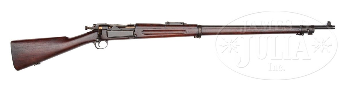 SN 386799. Cal. 30-40 Krag. Standard Military rifle with 30" tapered rd bbl, pedestal mounted front sight and 2000 yd ladder rear sight. Left side of receiver has usual Springfield Armory markings. Mounted in a one-piece, uncheckered American walnut stock with grasping groove forestock and short hand guard. Secured with a split front band/bayonet lug that has stacking swivel and middle band with sling loop and corresponding sling loop in the butt stock. Left side of the wrist has a crisp 1902 cartouche. CONDITION: About fine. Bbl and bands retain a dull blue brown patina, probably from hanging over a fireplace. Receiver, side plate and cartridge box retain a blue brown patina. Stock has a few scratches, handling and storage nicks and dings and overall the wood retains most of its orig arsenal oil finish. Mechanics are fine. Strong bright bore, frosty in the grooves. 4-48375 JR290