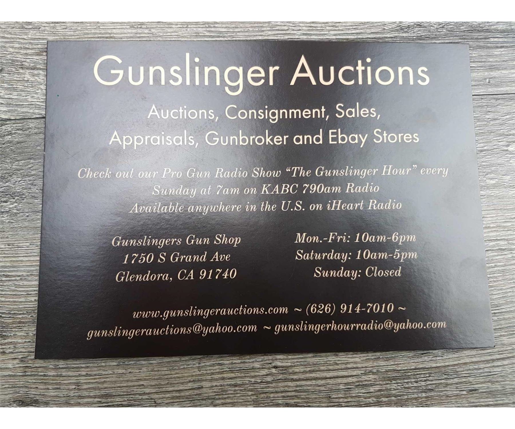 14. ALL FIREARMS WILL BE SOLD BY Gunslinger Auctions, a Federal Firearms License (FFL) Licensee in California. California BUYERS-Must pass the California Bureau of Investigations background check for all firearms. A $35 fee will be charged for the background check. If you do not pass the background check, you still must pay for the firearm(s), and they will be sold at a later auction and appropriate commission will be charged. Guns must be picked up by the purchaser at Gunslinger Auctions. All purchases will be charged to your credit card the day after the auction, once shipping charges are determined, your credit cards will again be charged for shipping. No one but the purchaser will be allowed to pick up the firearms. BUYER'S FROM OUTSIDE CALIFORNIA OR OUT OF AREA BUYERS- IMMEDIATELY FOLLOWING THE AUCTION YOUR CREDIT CARD WILL BE CHARGED FOR YOUR PURCHASES AND BIDDING FEE'S. YOU ARE REQUIRED TO Contact a Federally licensed firearm dealer in your state who will accept shipment and transfer the firearm to you in your state. YOU ARE RESPONSIBLE TO DETERMINE YOUR ABILITY TO PURCHASE A FIREARM IN YOUR STATE. IF YOU FAIL TO QUALIFY IN YOUR STATE YOU WILL THEN OWN A WEAPON THAT YOU CAN'T POSESS. ALL SALES ARE ABSOLUTELY FINAL ON THE DAY OF SALE. Gunslinger Auctions will arrange shipping on all firearms through a local pack/ship company or a national company of your choice. The cost of the shipping will be paid by the purchaser prior to shipment. HANDGUN'S REQUIRE OVERNIGHT SHIPPING. Visa, Master Card and American Express are accepted for payment. YOU MUST BE OVER 21 YEARS OLD TO BUY LONG GUNS. YOU MUST BE OVER 21 YEARS OLD TO BUY HANDGUNS ATF FORMS WILL BE FILLED OUT ON ALL GUNS, with the exception of pre 1898 antique's. Gunslinger Auctions has not fired any firearm in this auction (Unless otherwise noted). As such we cannot and do not warranty these items. Our conditions range from New in Box, Outstanding, Excellent, Very Good, Good, Fair & Poor. Please pay attention to our ratings. They are our opinions ONLY, so you should make every effort to inspect them yourselves.