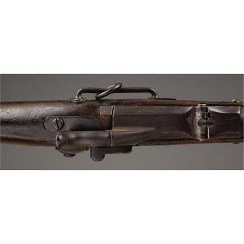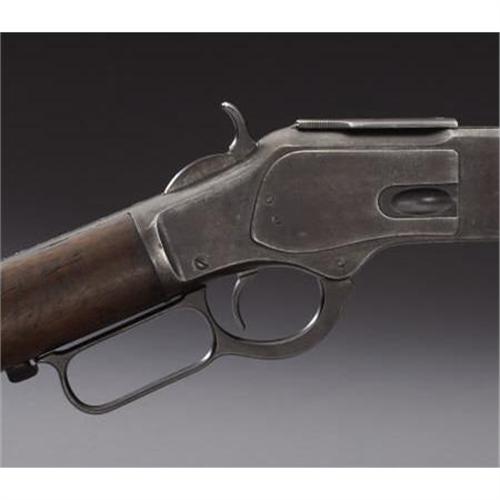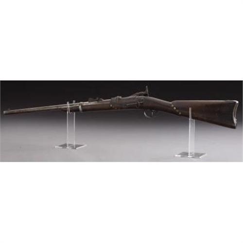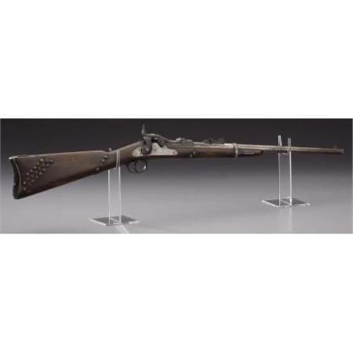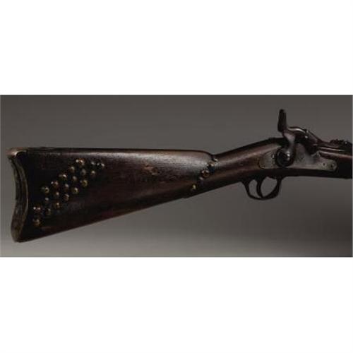 <B>SPRINGFIELD TRAPDOOR SADDLE RING CARBINE</B></I> - Serial #114826, 45-70 caliber. Circa 1880s. This carbine is basically a composite of original parts, with a variety of condition, from even patina to lightly cleaned. In addition to "U.S.", butt plate is stamped "245". Tack decoration has been added to both sides of stock. Rear of stock on right side has been stamped "Cavalry 9th." Functioning action. An attractive Indian Wars Vintage carbine decorated to imply Indian usage. <BR><BR><B>Condition:</B></I> Wood heavily sanded and stained. Metal surfaces a mix of condition as noted above. Additional stain applied to stock around area of tack decoration.<BR><BR><b>Shipping:</b> Bats, Clubs, Sticks, Swords, Rif (<a target="_blank" href="http://www.heritageauctions.com/common/shipping.php">view shipping information</a>)