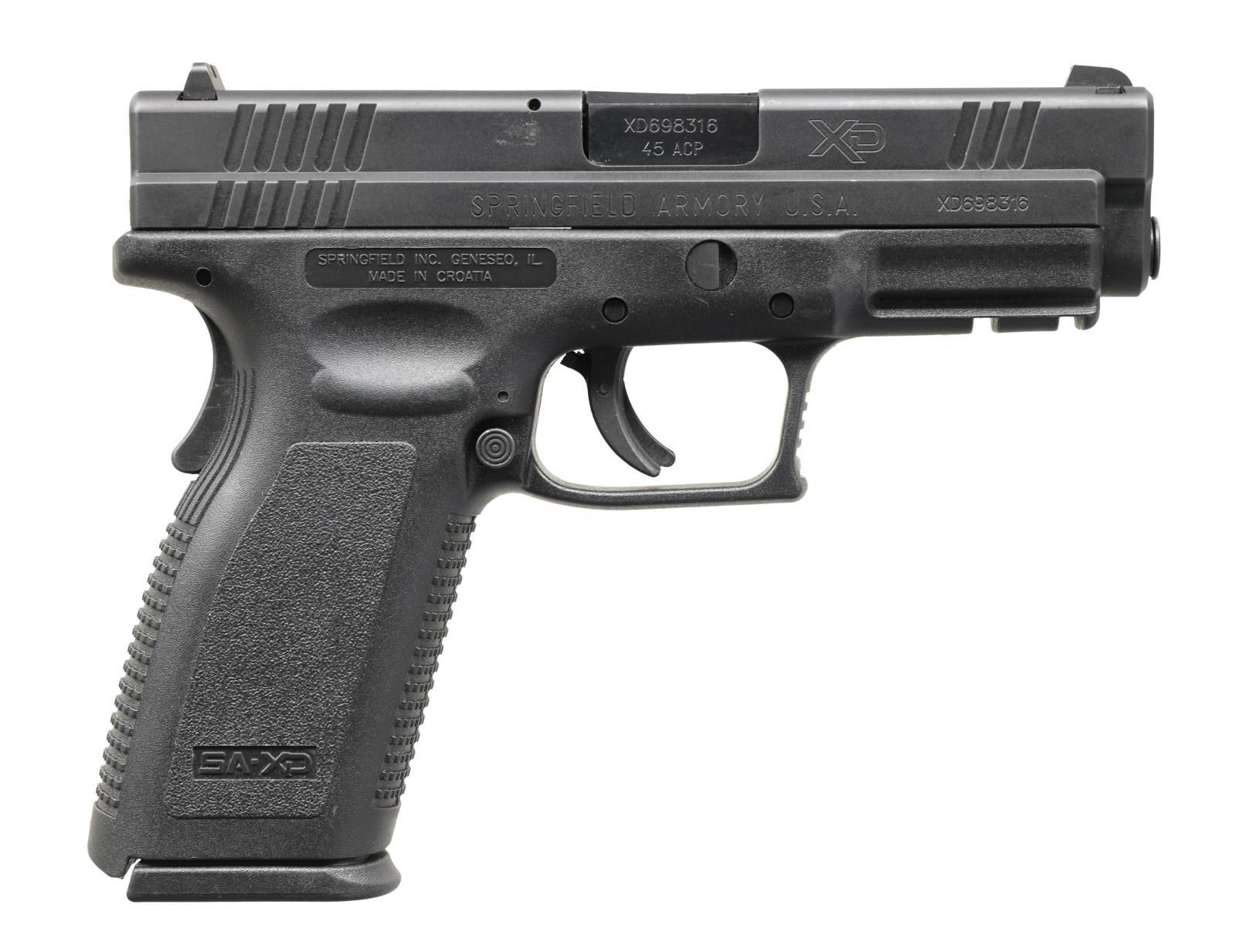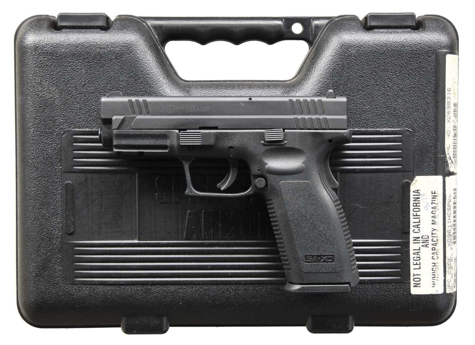 Cal. 45 ACP. S# XD698316. Bbl. 3 3/4". Three dot sights. Matte black finish. Polymer frame w/ grip safety & accessory rail. MAGS: 2-13 rd. UNATTACHED ACCESSORIES: matching numbered factory hardcase w/ dual mag pouch, holster & mag loader. CONDITION: slide & frame show scattered light handling marks. Very good plus bright bore. (23-5222/MJC). MODERN. $350-550.