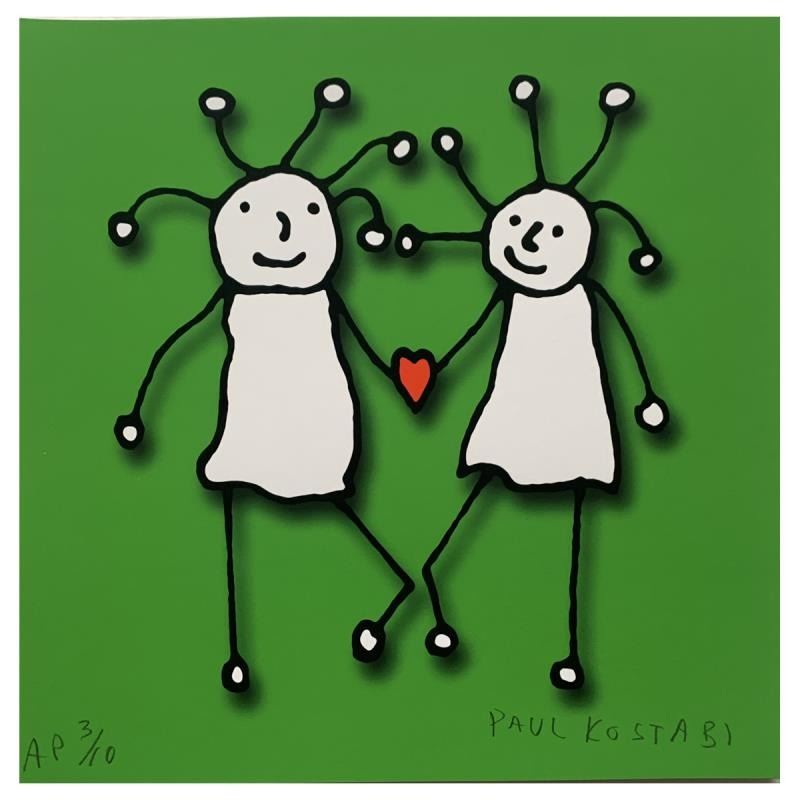 "SPRKL Love (Green)" is a limited edition giclee on paper by Paul Kostabi. Hand signed and numbered, the piece some with a letter of authenticity. Measures approximately 12" x 12".