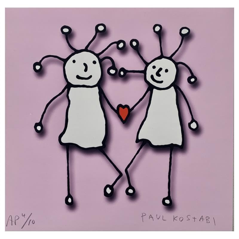 "SPRKL Love (Pink)" is a limited edition giclee on paper by Paul Kostabi. Hand signed and numbered, the piece some with a letter of authenticity. Measures approximately 12" x 12".