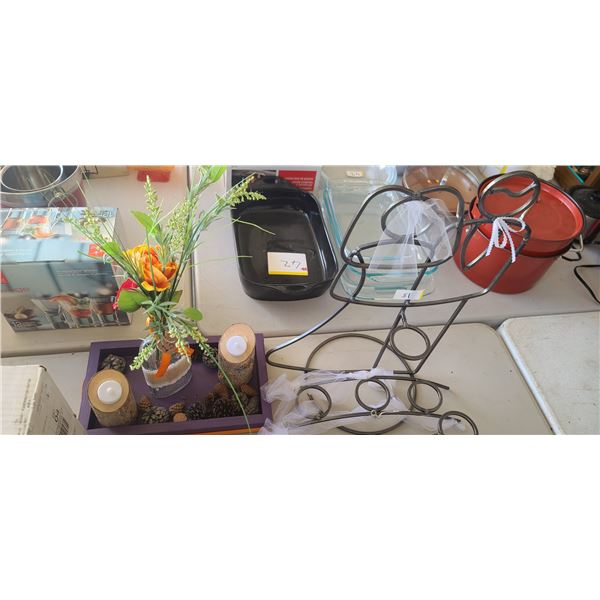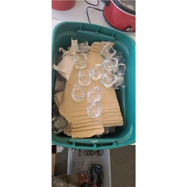 PLASTIC CONTAINER WITH CANDLE HOLDERS AND TALL CANDLE STAND PLUS 3 SMALL ROD IRON CANDLE HOLDERS