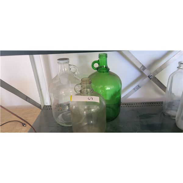THREE MILK BOTTLES AND ANTIQUE IRON