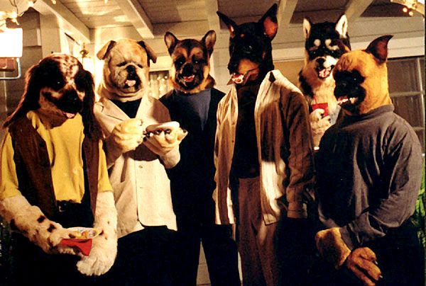 This is 1 of 7 different OOAK dog masks that were created by hand for an elaborate sight gag in Rusty (TALES FROM THE HOOD) Cundieff's romantic comedy SPRUNG. The female lead referrs to a bunch of horny guys at a party as "a pack of dogs" and they morph into just that.