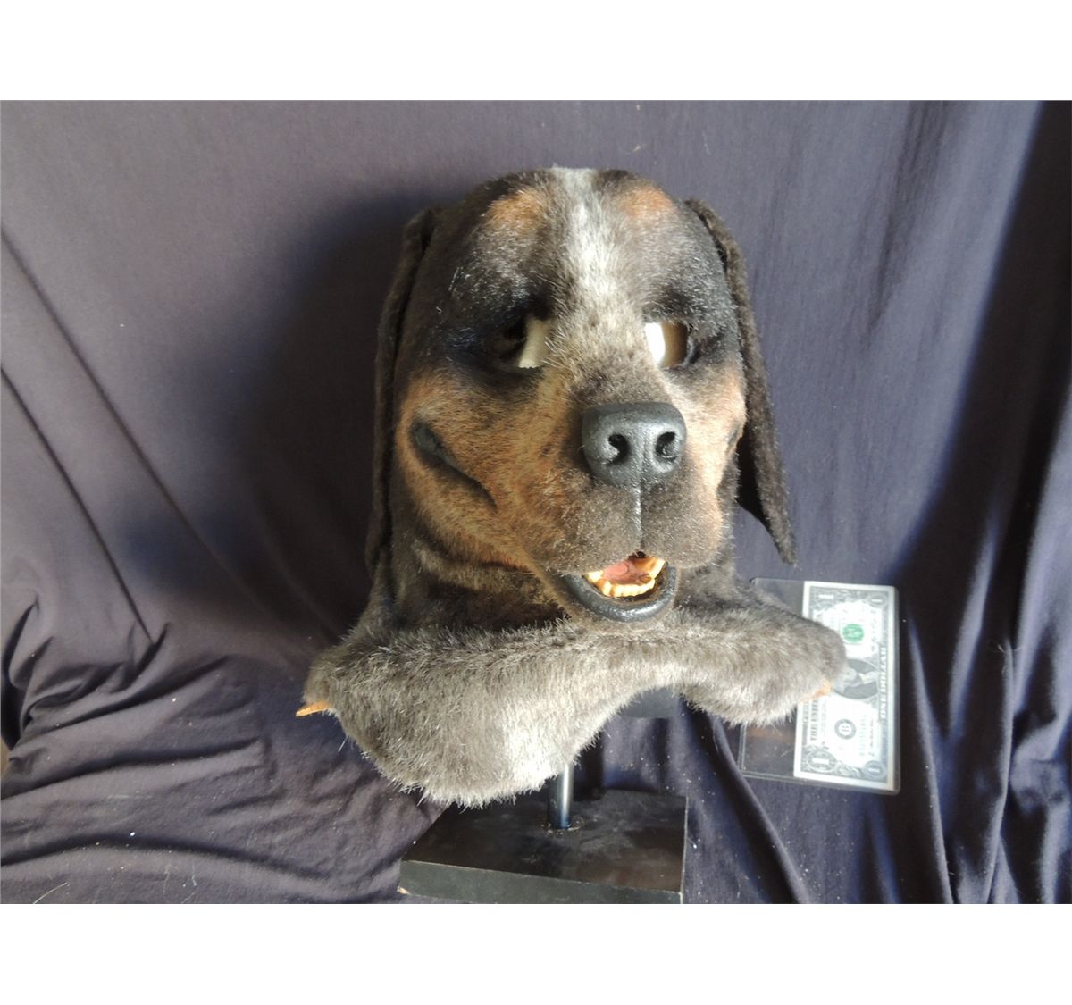 This is 1 of 7 different OOAK dog masks that were created by hand for an elaborate sight gag in Rusty (TALES FROM THE HOOD) Cundieff's romantic comedy SPRUNG. The female lead referrs to a bunch of horny guys at a party as "a pack of dogs" and they morph into just that.