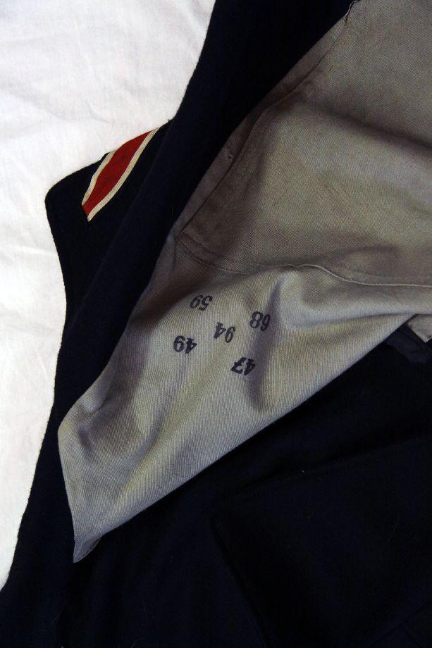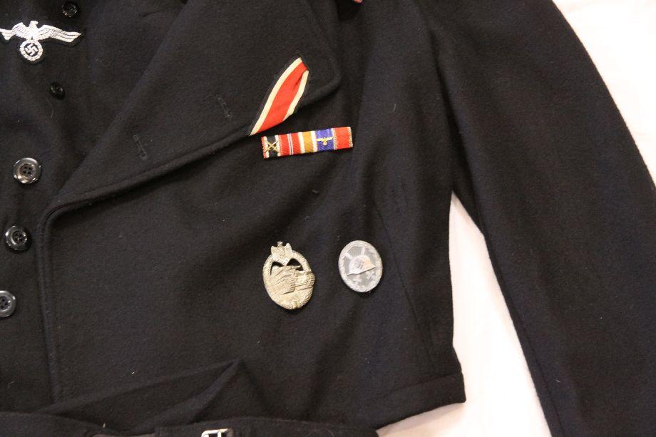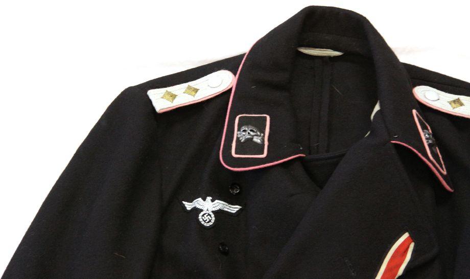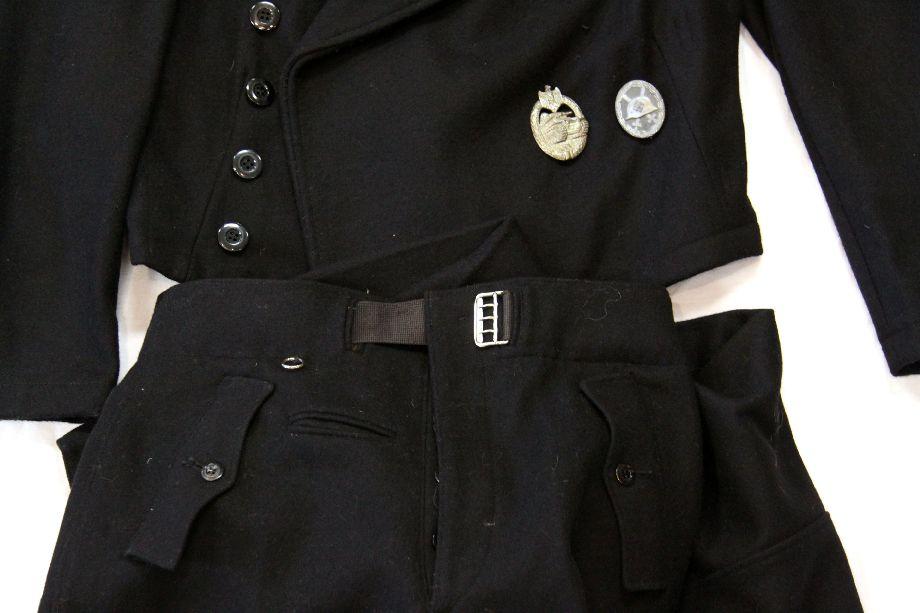 WWII German SS Panzer wraparound tunic, and black trousers. Clothes themselves appear to be period but insignia and badges are either reproduction or questionable, and placed on uniform. Overall very good condition, displaying panzer assault and wound badges, totenkopf skull collar tabs, shoulder boards, and colors. Very good condition, and good display piece.