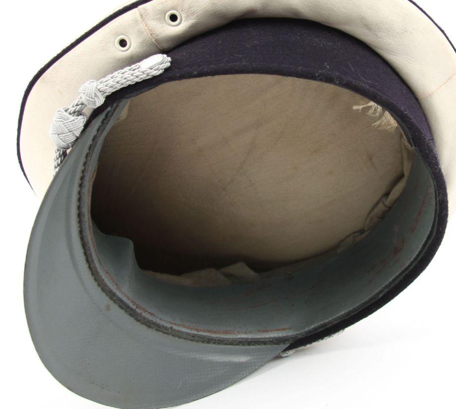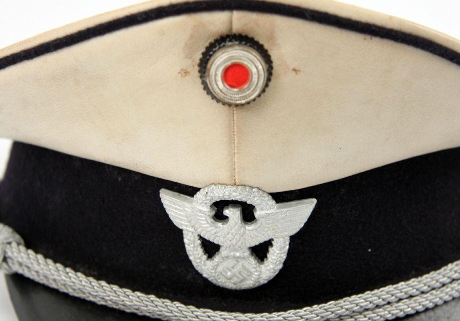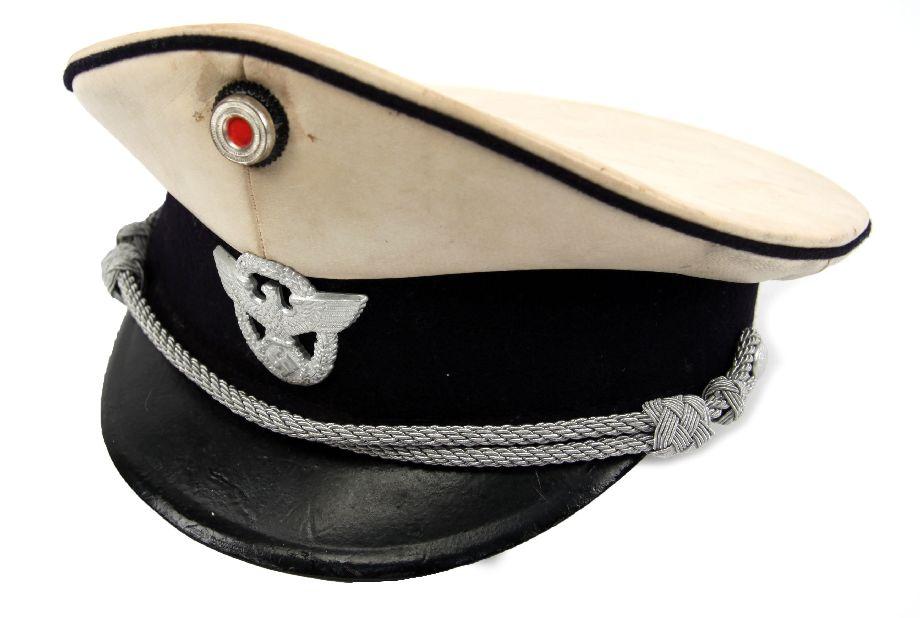 White vinyl peaked visor cap, with spurious WWII German insignia, and chin cord. Red cockade at peak appears original to hat. Good condition, with some discoloration and age.
