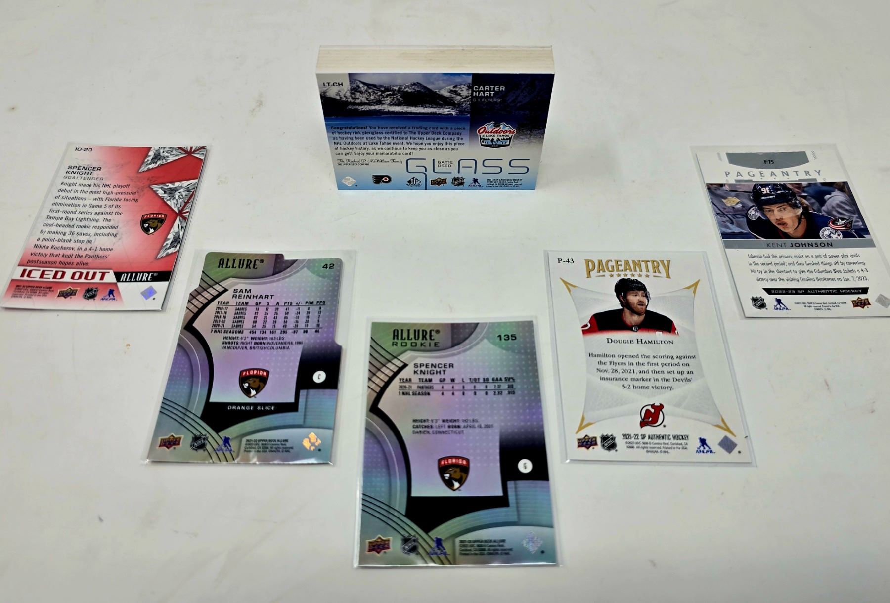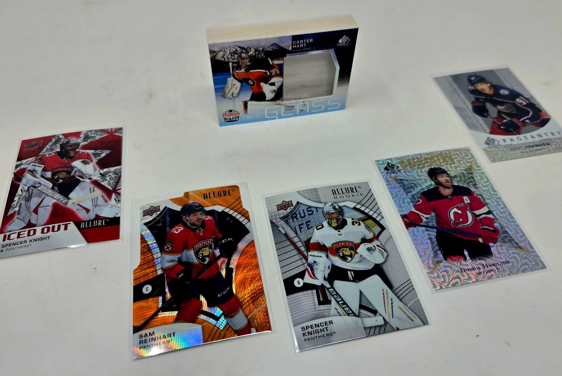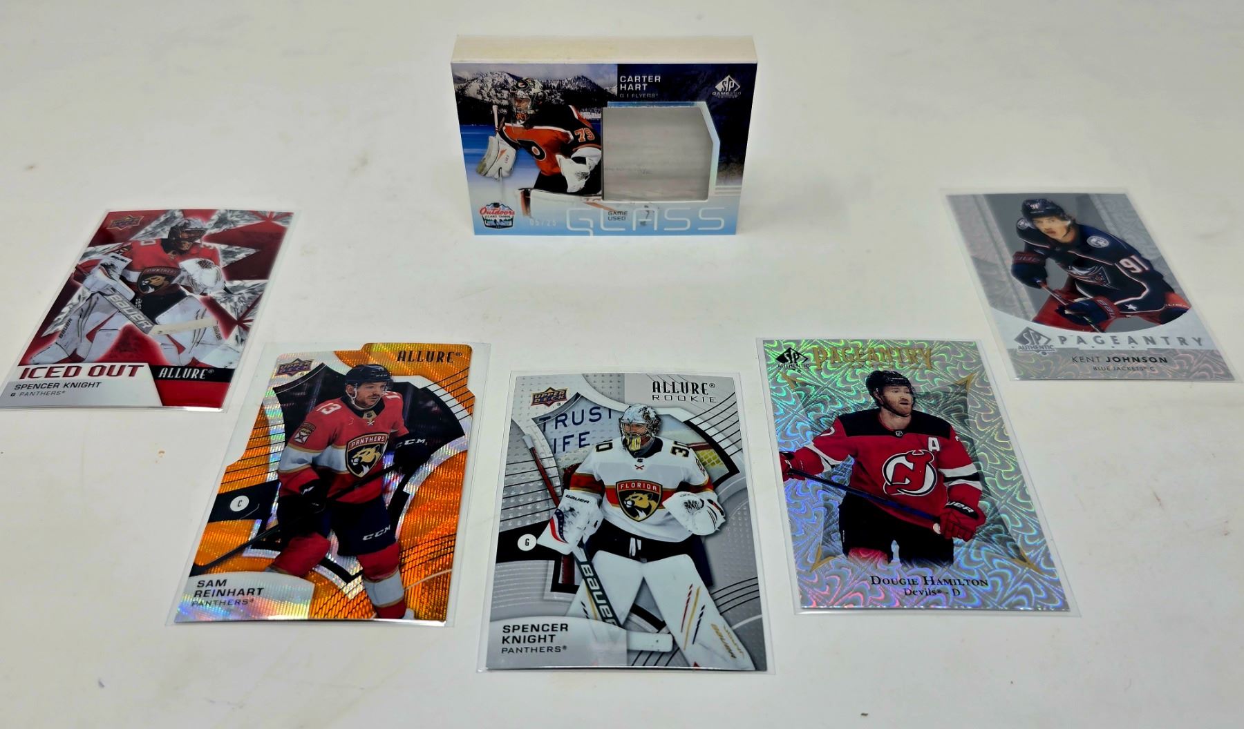 6-card insert and rookie lot featuring a Carter Hart SP Game Used “In the Glass†jersey relic (/75), Spencer Knight “Iced Out†and “Trust the Ice†Allure cards, and an Orange Cracked Ice parallel of Sam Reinhart. Also includes SPx Pageantry cards of Kent Johnson (rookie) and Dougie Hamilton (Rainbow FX). All cards sleeved and vibrant.