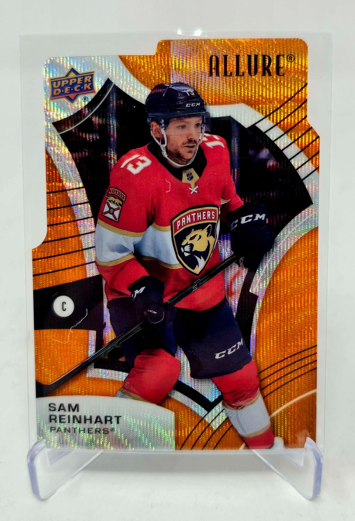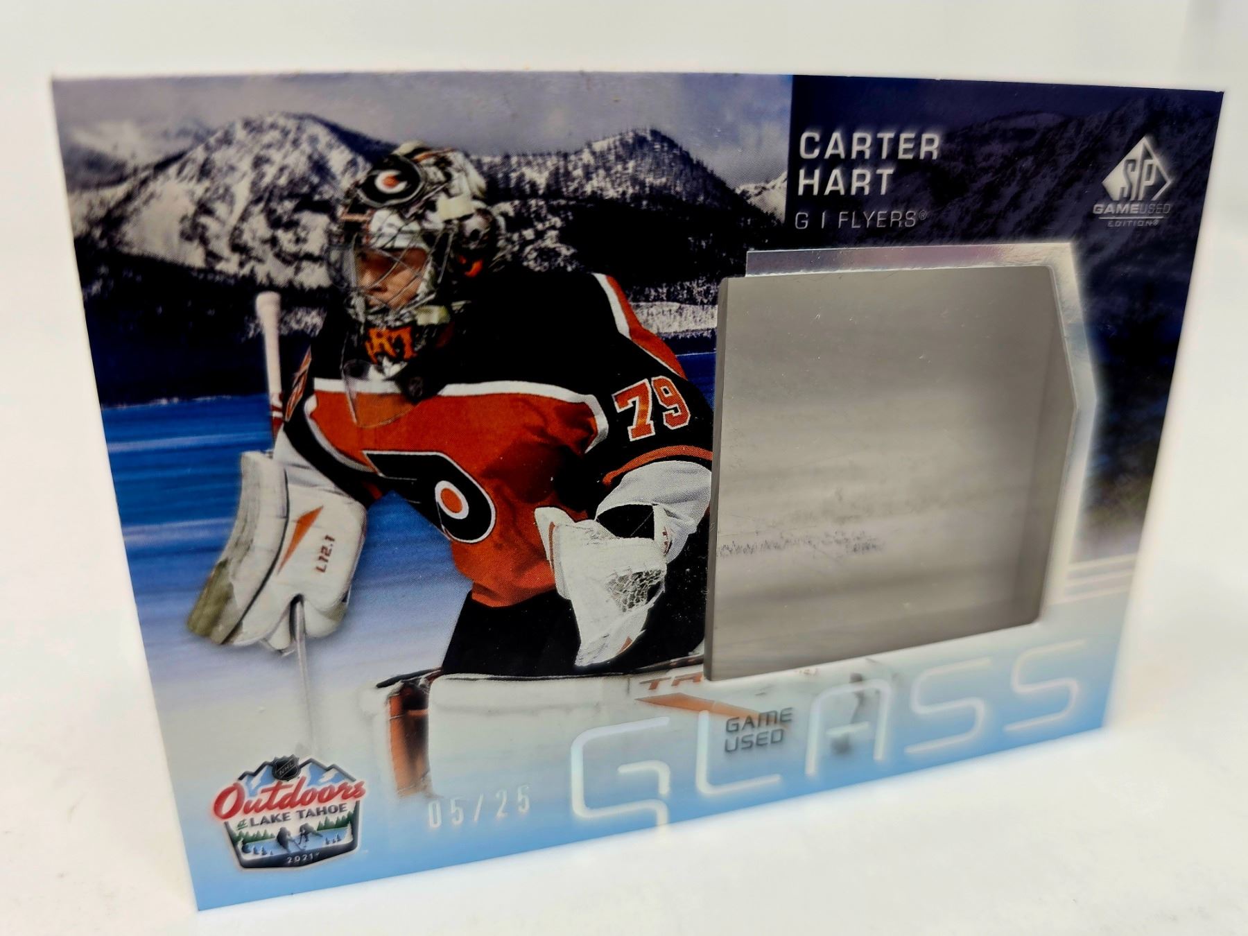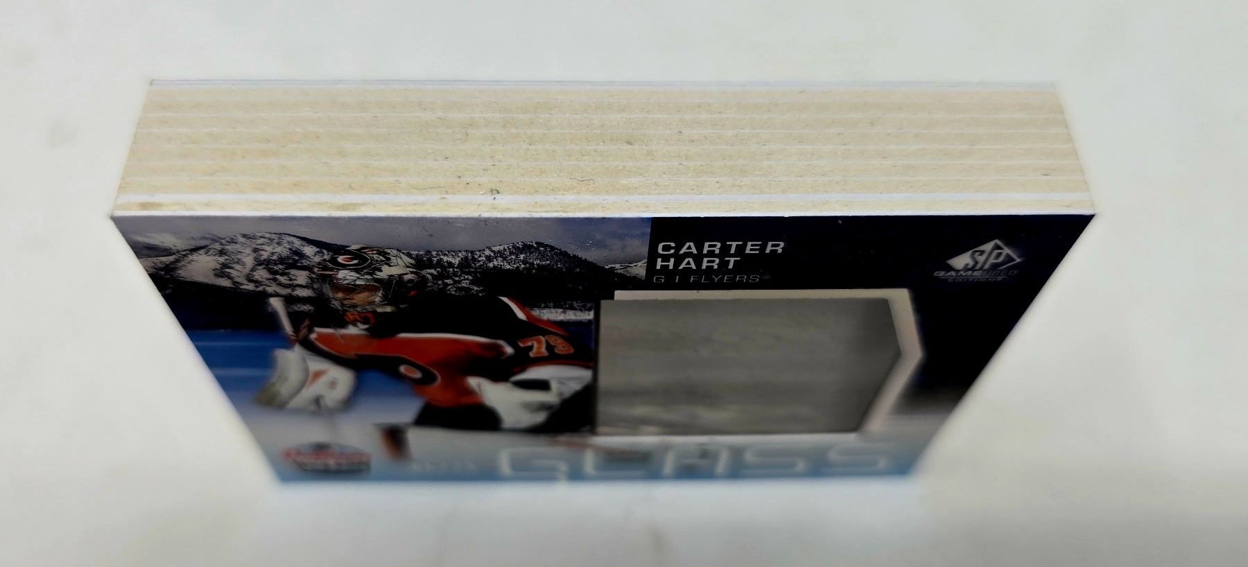 6-card insert and rookie lot featuring a Carter Hart SP Game Used “In the Glass†jersey relic (/75), Spencer Knight “Iced Out†and “Trust the Ice†Allure cards, and an Orange Cracked Ice parallel of Sam Reinhart. Also includes SPx Pageantry cards of Kent Johnson (rookie) and Dougie Hamilton (Rainbow FX). All cards sleeved and vibrant.