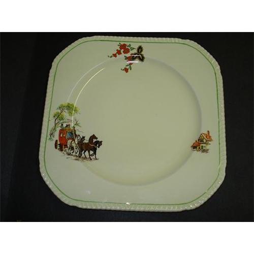 LOVELY SQUARE SERVING PLATTER, MADE IN ENGLAND - DEPICTING CHARMING ENGLISH COTTAGE TRAVELING COACH WITH HORSES ETC. - as per images - Measuring about 9 1/2 inch in square. Excellent,used condition, no chips or cracks, US Buyer to pay 8.00 for shipping plus insurance.THANKS.