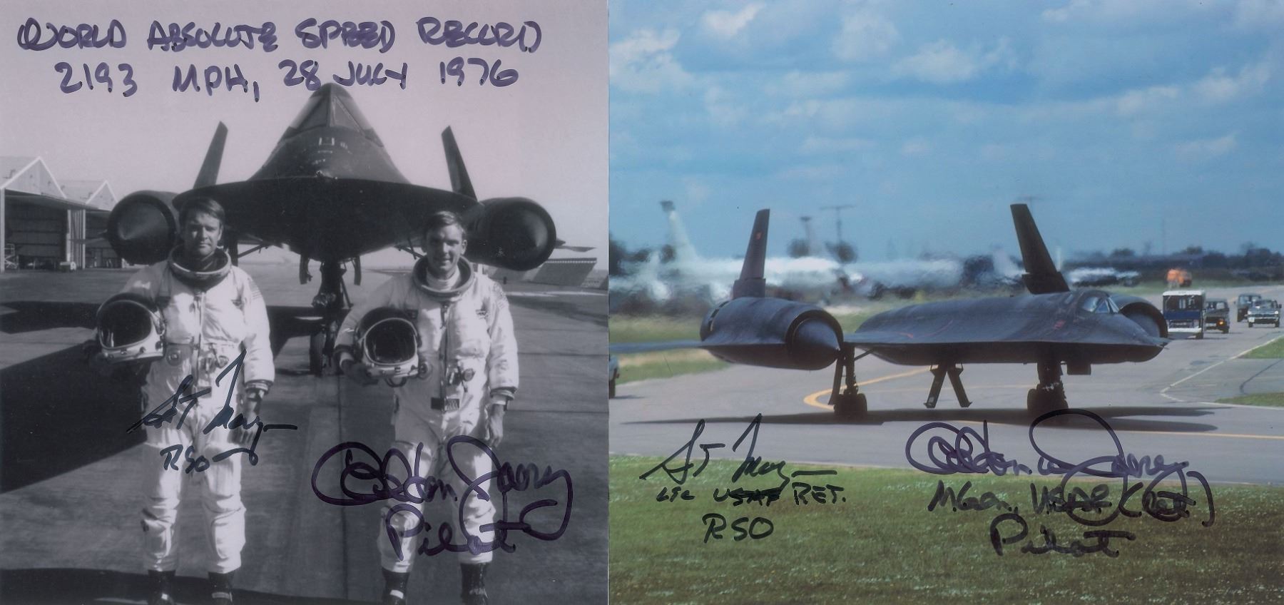 Two glossy photos, 8 x 8 and 10 x 8, signed by in black felt tip by Eldon W. Joersz and George T. "GT" Morgan, Jr., pilots who set an air speed record of 2,193.167 mph on July 28, 1976 in a SR-71A Blackbird 61-7958 at Beale Air Force Base. The photos depict the pilots and their record-breaking aircraft. In overall fine condition. Accompanied by personal calling cards signed by both pilots.