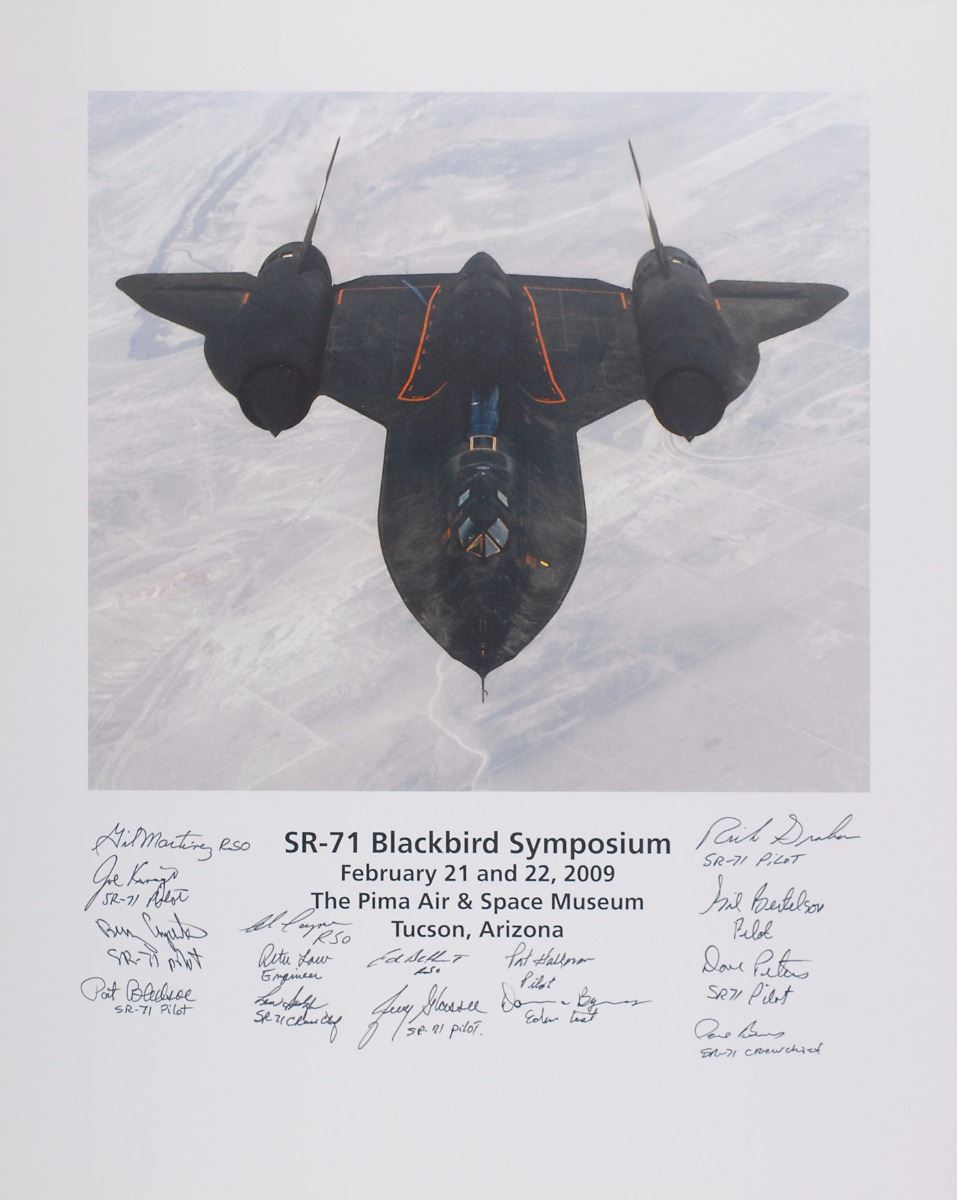 Appealing color 16 x 20 print for the SR-71 Blackbird Symposium held at the Pima Air and Space Museum in Tucson, Arizona on February 21–22, 2009, signed in the lower border in black felt tip by 15 pilots and crew members, including: “Gil Martinez, RSO,” “Joe Kinego, SR-71, Pilot,” “Billy Carpenter, SR-71, Pilot,” “Pat Bledsoe, SR-71, Pilot,” “Al Payne, RSO,” “Peter Law, Engineer,” “Ed Bethart, RSO,” “Jerry Glasser, SR-71, Pilot,” “Pat Halloran, Pilot,” “Donn A. Byrnes,” “Rich Graham, SR-71, Pilot,” “Gil Bertelson, Pilot,” “Dave Peters, SR71, Pilot,” and two others. In fine condition.