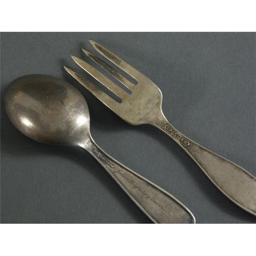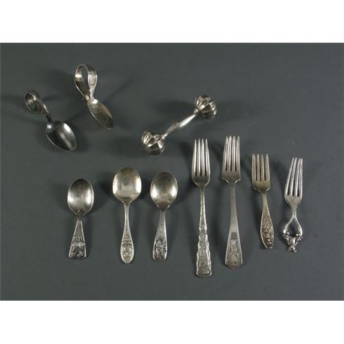 STERLING: Ten assorted pieces of sterling silver children's spoons and forks also to include a child's rattle. Weight: 5.6 ozt.