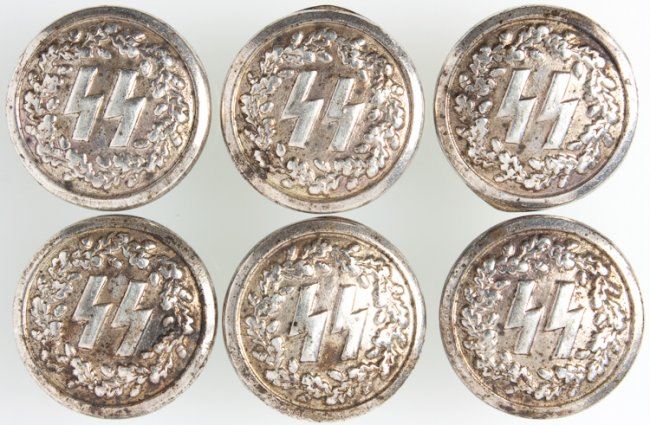 Six buttons 0.71" (18 mm) in diameter, with the SS insignia surrounded by oak leaves, shiny silver finish, probably nickel, for an evening dress uniform or vest. Manufactured by the Austrian firm of Gebruder Schneider, Wien (BSW). "BSW" letters stamped on reverse and the famous "BSW" clover leaf makers mark. Non-RZM, post-1938. Included is an unidentified gold finish medal with black and red band, 15mm width and height.