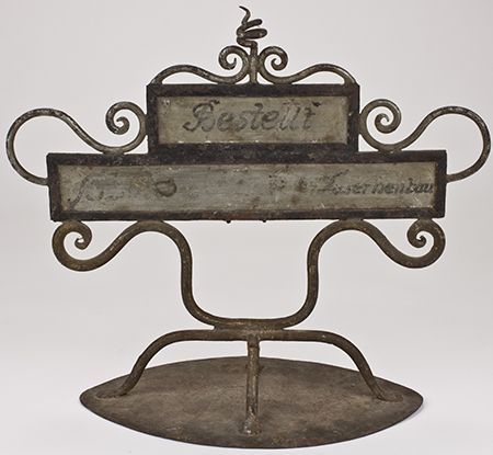 A grim piece of advertising made for a contractor to the SS, an ornate wrought iron table piece owned and used by the firm to indicate that a particular table had been reserved for a party from the company, but obviously intended to impress the viewer and to advertise the firm. This fancily crafted piece stands 13" tall and is 14 1/2" wide. Both sides bear the painted name "Schmitt u. Funk SS Barracks" with "Reserved" appearing above. Some oxidation, with a few letters here and there worn, else very good.