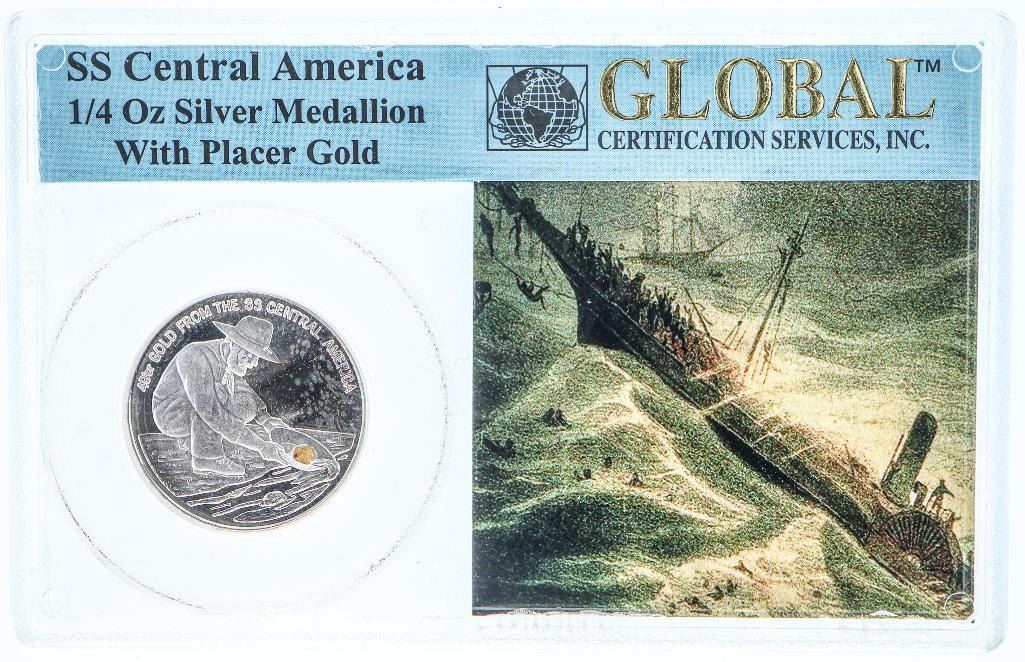 SS Central America 1/4 OZ Silver Medallion With Placer Gold. The California Goldrush -Triumph & Tragedy. Recovered From the Wreck of the ill fated treasure ship SS Central America. Certified