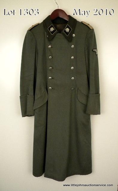 SS Colonel’s overcoat with possibly incorrect collar tabs, correct shoulder boards, correct buttons, incorrect sleeve eagle. Good condition. A real overcoat with applied decorations and insignias. Est: $500 - $1,000