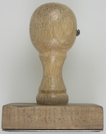 Scarce handstamp, an SS Feldpost (mail) handstamp reading: "SS - Pi[ioneer]. Btl. 4" above a Nazi eagle and swastika device, set into a rectangular holder embossed:"SS- Feldpost", 2 1/2" x 1 3/4" overall, which is in turn attached to a 3 1/2" wood handle. Seal is oxidized but still imprints fairly well.