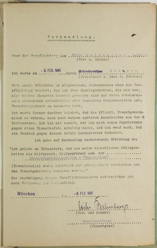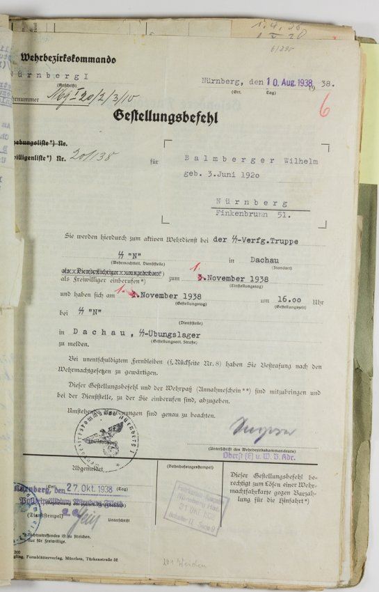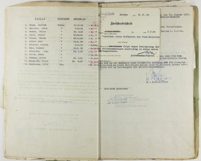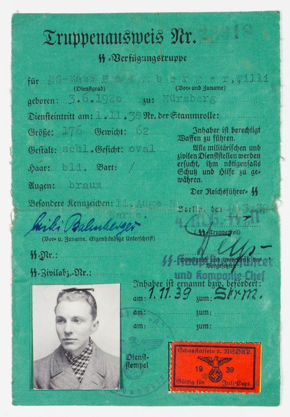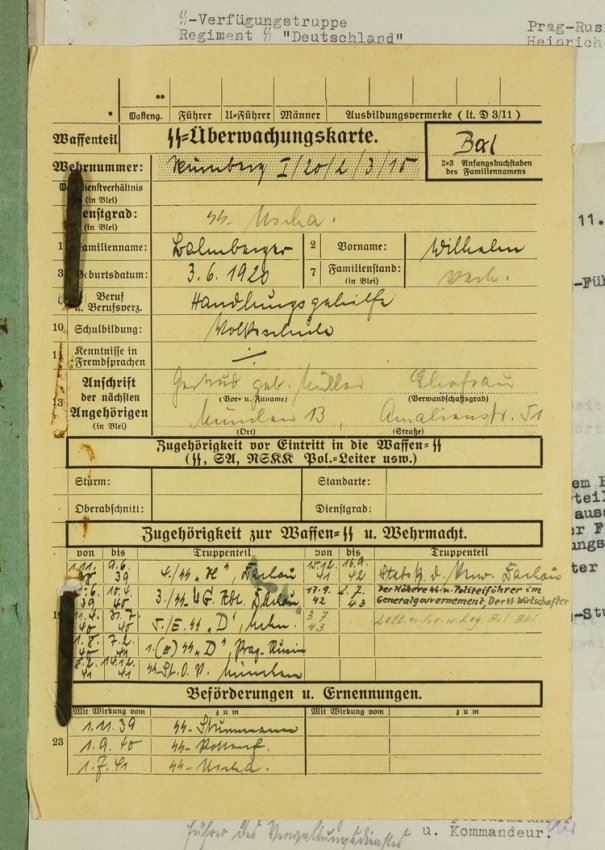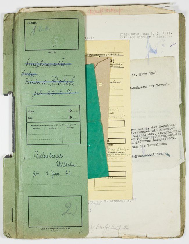 Complete SS personnel file of SS Unterscharfuhrer Wilhelm Balmberger, born in Nuremberg June 3, 1920 and who joined the SS on Nov. 1, 1938 at Dachau. This is an exhaustive file, including the man's "SS Truppenausweis", or troop identity card; his SS service contract; an evaluation which indicates he had a less than ideal private life; reports on an injury and his lengthy duty in administrative roles at Dachau and in Prague; his poor performance as a soldier and constant chastisement, along with his inappropriate love of partying and failure to understand the National Socialist ideology; transfers, recommendations, etc. In all about forty or more documents which should be examined.