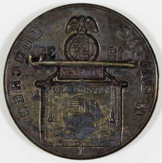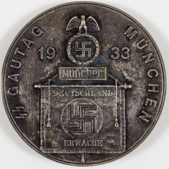 Controversial "tinnie", a 1 3/4" stamped metal pin commemorating the 1933 "SS Gautag Munchen" and displaying a "Deutschland Erwache" banner, period pin affixed to verso. Collectors disagree on whether or not this is a "fantasy" piece, thus it is sold "as is".