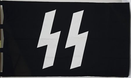 Impressive double-sided SS banner bearing white SS runes about which is sewn into (vs. onto) the flag's black field, 86" long, 54" wide, with four suspension loops each an additional 2" long, the terminal loops on the banner also bearing unmarked clips which were painted black. The fly and opposite end of the banner have been reinforced with a second layer of separately-sewn fabric for strength, and the far corners of the flag have been stitched to reduce tattering. A 1 1/4" x 1/2" white tag has been stitched to the verso of the upper fly of the flag, reading:"Jakob Zeiler Geisenhausen/Ndb.". This flag was obviously intended for interior use, likely in a meeting hall or other such facility. One small lightened area in the black field due to exposure to sunlight, else very good.