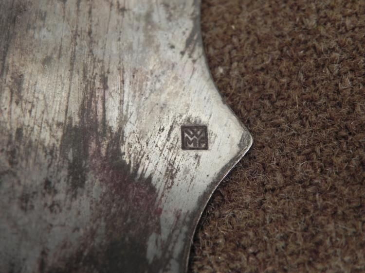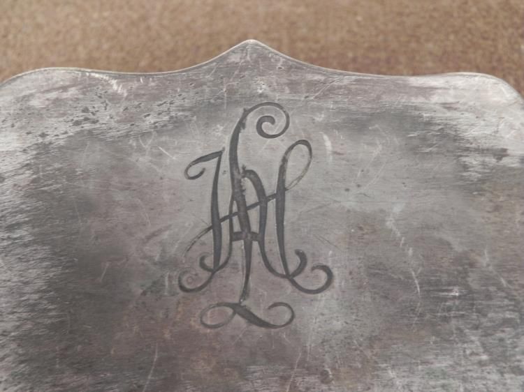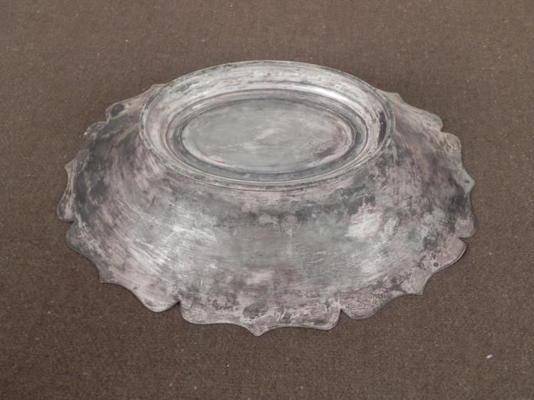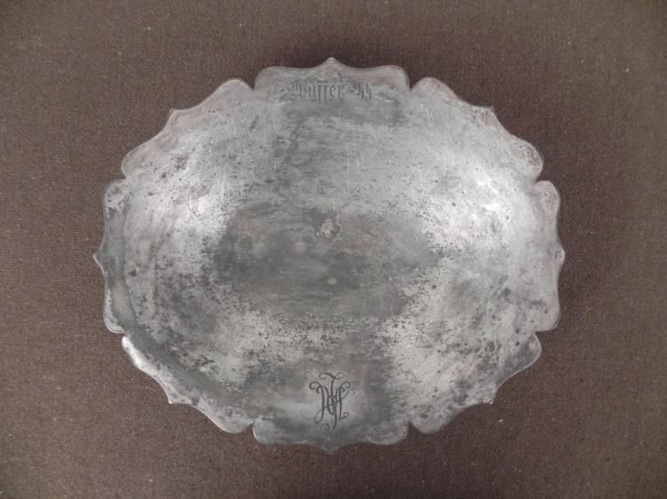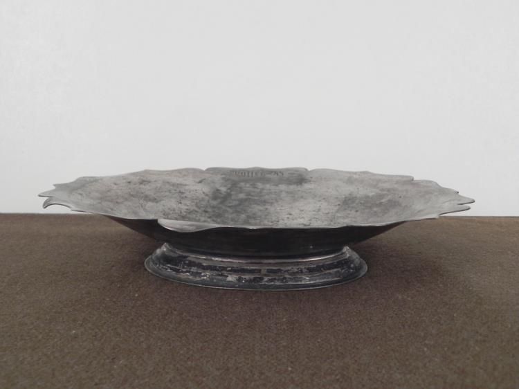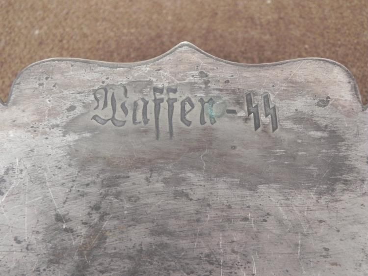 SS LEIBSTANDARTE ADOLF HITLER-WAFFEN SS ENGRAVED SILVER AWARD BOWL- * * * THIS IS A RARE AWARD IN THE FORM OF A BOWL WITH BASE-SS LEIBSTANDARTE ADOLF HITLER OR THE 1st SS PANZER DIVISION WAS AN ELITE SS GROUP BEARING HITLER'S NAME FORMED IN 1933. THE MEN, ALL AT LEAST 6 FEET TALL WERE FIERCELY LOYAL TO HITLER AND FEARED BY ALL.-THE AWARD BOWL IS 8 1/2" X 10". WITH A SCALLOPED EDGE. 2" TALL WITH BASE--ONE SIDE ON TOP IS ENGRAVED "WAFFEN-SS" AND THE OTHER SIDE TOP "LAH" IN INTERTWINED FANCY LETTERING. SHOWS MUCH WEAR TO THE PLATING.