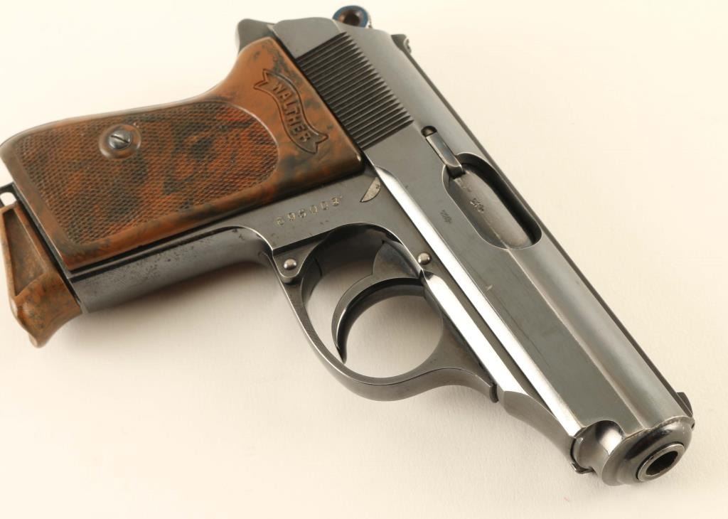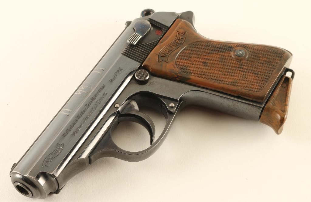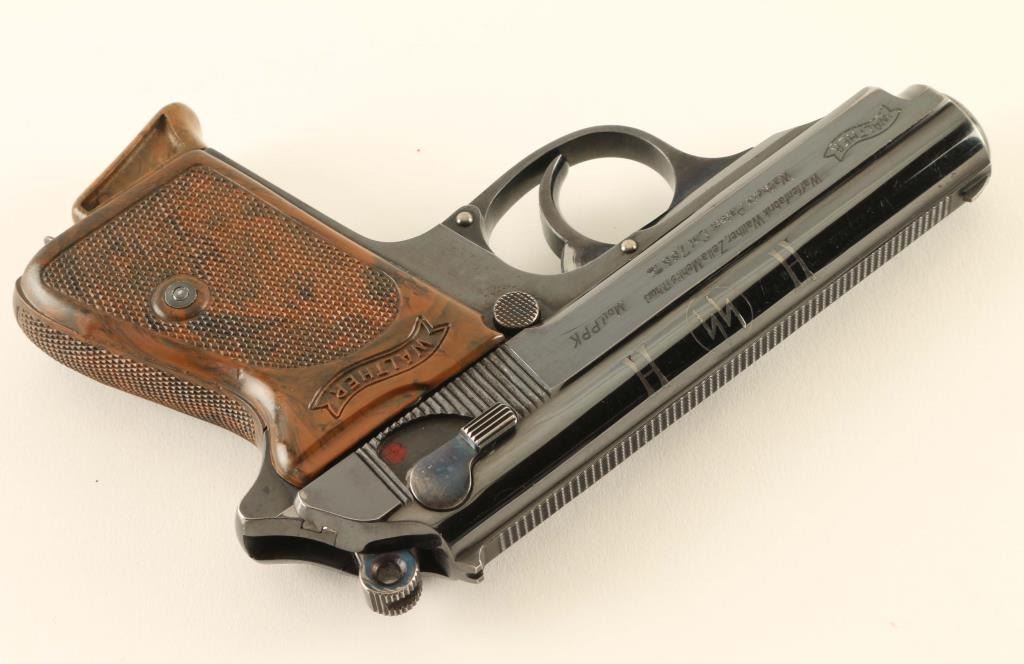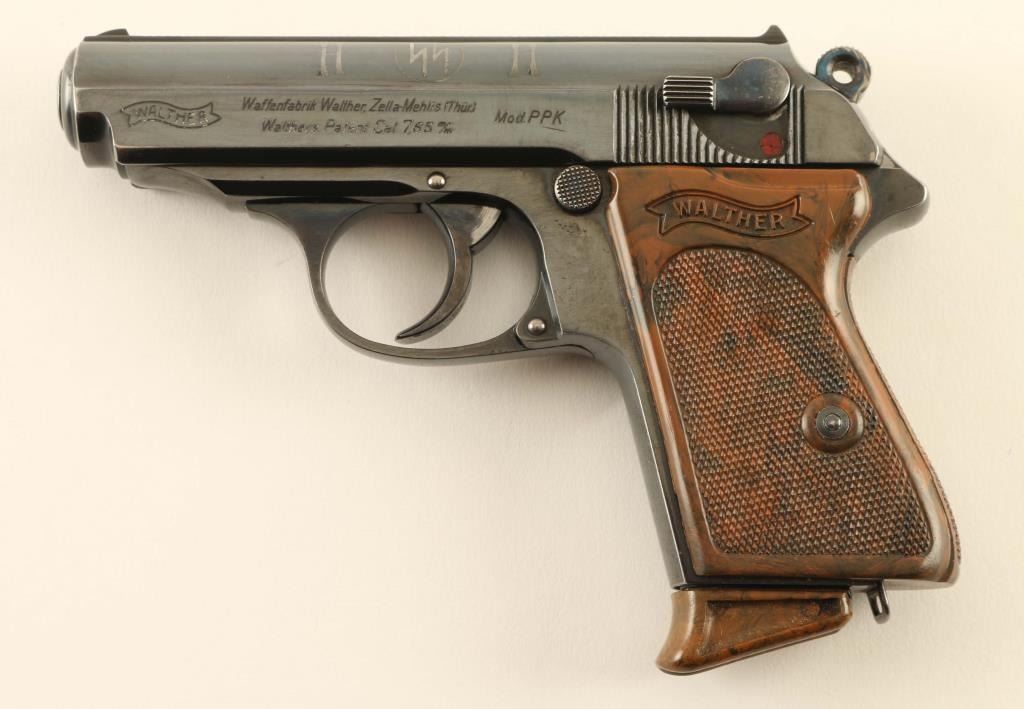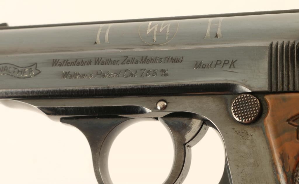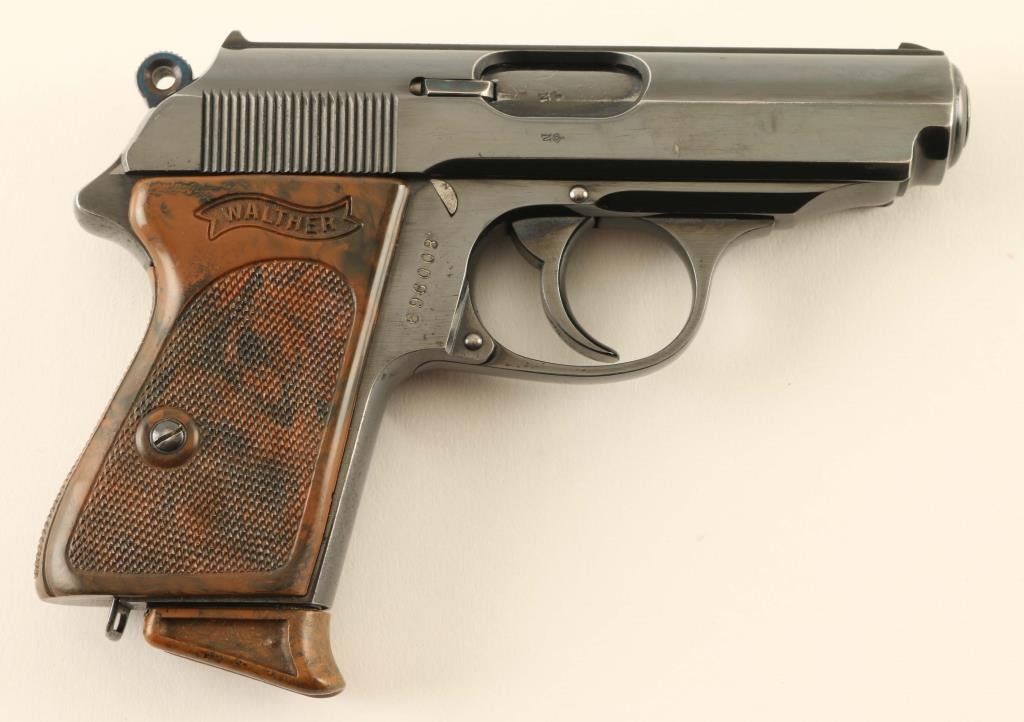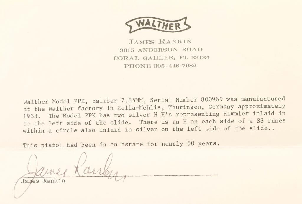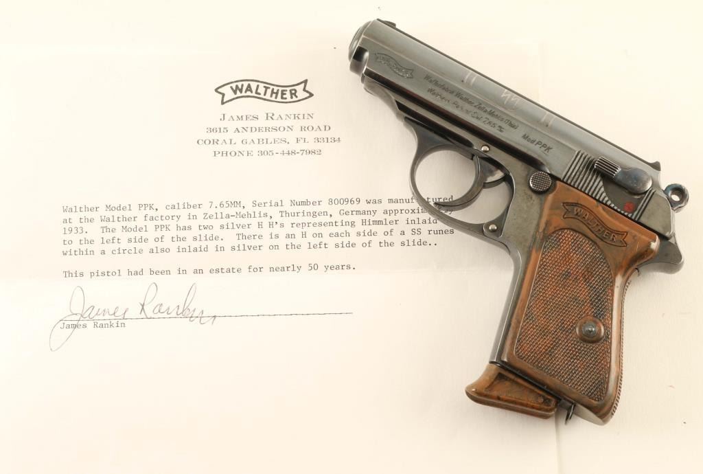 Double action semi-automatic compact pistol chambered in 7.65mm Browning, manufactured in Zella-Mehlis, Thuringen, Germany circa 1933. This pistol has ties to Heinrich Himmler and is accompanied by a signed letter from Walther expert James Rankin. The letter reads “The Model PPK has two silver H H’s representing Himmler inlaid in to the left side of the slide. There is an H on each side of a SS runes within a circle also inlaid in silver on the left side of the slide.. This pistol has been in an estate for nearly 50 years.” Features a lustrous blued finish, 3.3" fixed barrel, fixed sights with blade front & ‘u’ notched rear, smooth trigger, serrated round hammer spur, manual safety/decocker on the left side of the slide, loaded chamber indicator, push button magazine release, factory 7 round magazine with Trolitan finger rest floorplate, and one-piece checkered brown/black marbled Trolitan grip with molded Walther banners. The pistol bears the marking described in Rankin’s letter and also has [crown]/”N” proofs on the barrel and slide. Pistol retains approximately 85% of its original polished blued finish showing holster wear, scattered handling marks/scratches and some pin prick pitting on the front strap. Action is crisp, the bore is semi-lustrous showing good rifling & some pitting and the synthetic grip is fine. Condition is NRA Very Good. ***C&R Firearm***