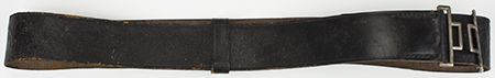 Black leather SS officer's belt, 381/2" overall, 1 3/4" wide, with leather retaining loop and two metal buckle attachments (buckle not present). Owner's name handwritten within: "Paul Rodenmacher". Some cracking to leather in a few places, still very good.