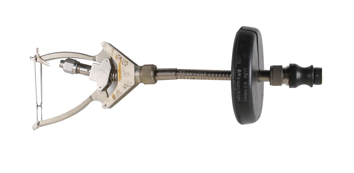 A ground support equipment SS-R4D rocket engine purge plug. The plug measures 15? long, with the metal parts bearing stamped and stenciled part numbers, and a hard rubber collar at the bottom of the flexible base labeled “Durometer 60/70.” In fine condition, with scattered dings, scratches, and toned adhesive.