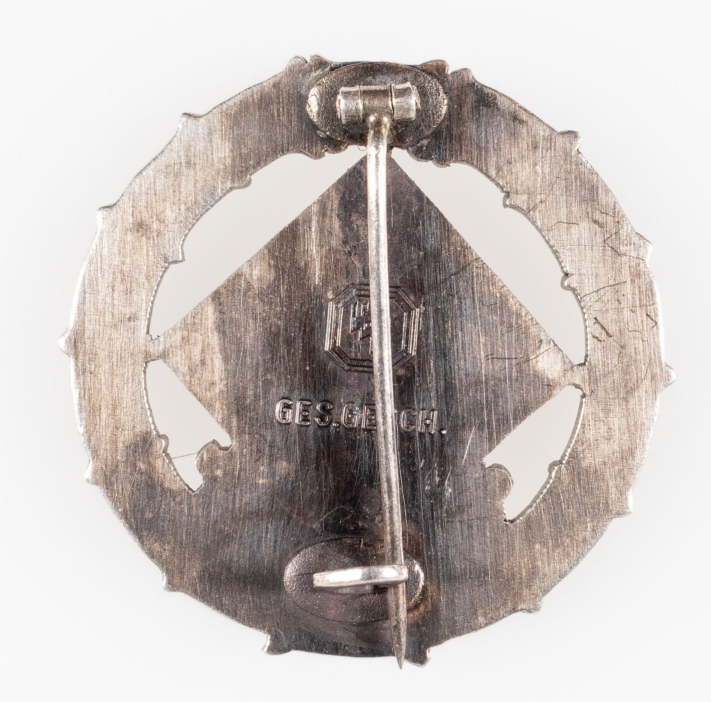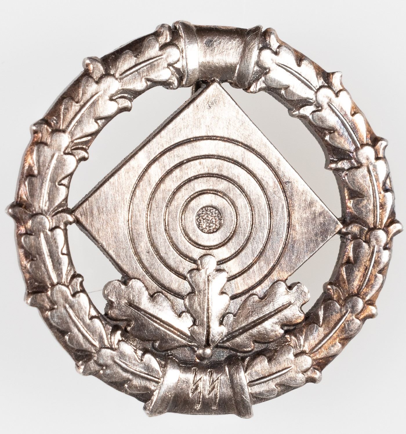 SS Shooting Badge of the highest reward with a target, three oak leaves, and an oak leaf wreath. Marked 'SS' on front and verso. Verso has 'Otto Gahr' design mark with 'SS' and 'Ges. Gesch.' Sold as-is.
