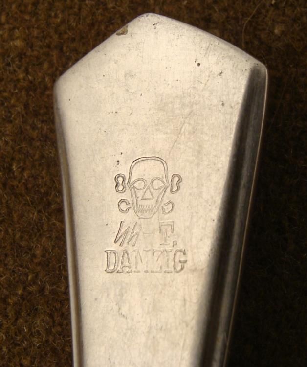 THIS IS A NICE ORIGINAL SS-T DANZIG DINING ROOM FORK WITH SKULL. THE HENKEL LOGO IS ON THE FRONT AND THE MAKER'S MARK, RONEUSEL ROSTFREI IS ON THE REVERSE. IT IS 8 1/4" LONG. * * * *
