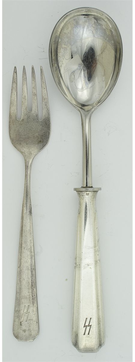 Lot of two pieces of tableware used by members of the SS, the first a composite metal fork with SS runes on the handle, 7" long, marked: "WMF 100 30", the second a gravy or vegetable spoon, composite metal handle with stainless steel spoon, similarly marked with runes but hallmark appears to read: "WMF".