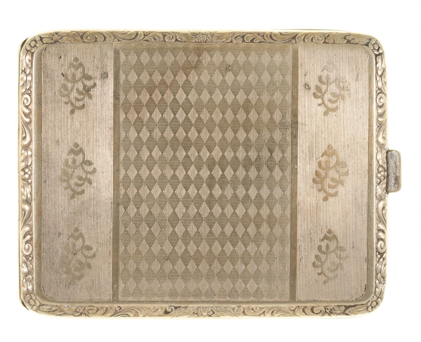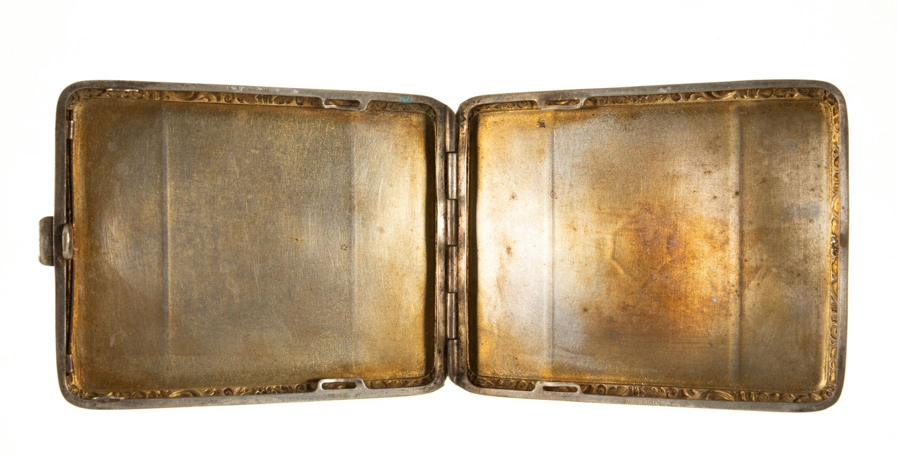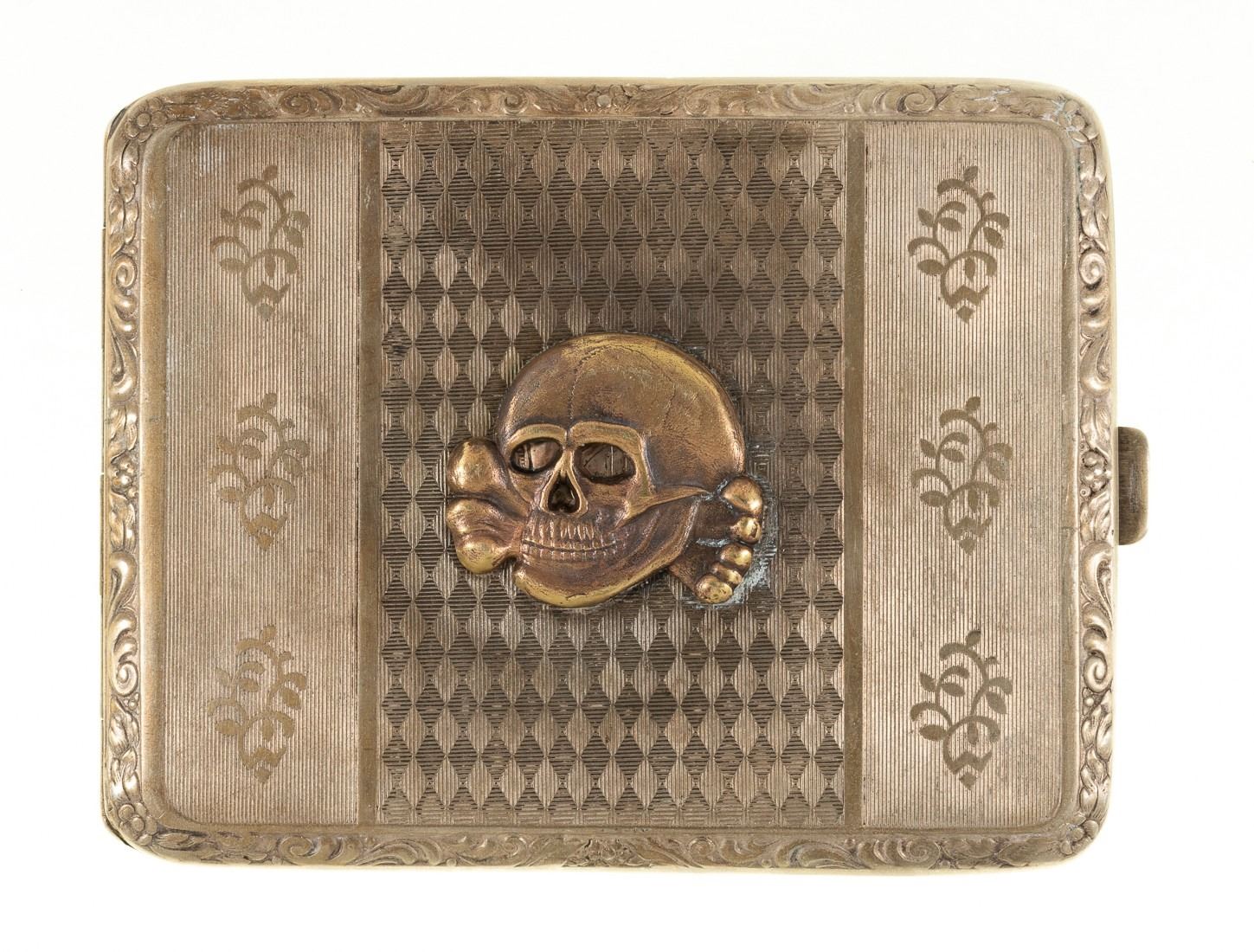 Cigarette case with a Waffen-SS Totenkopf affixed to front lid. Unmarked, 3.5 x 4 inches.