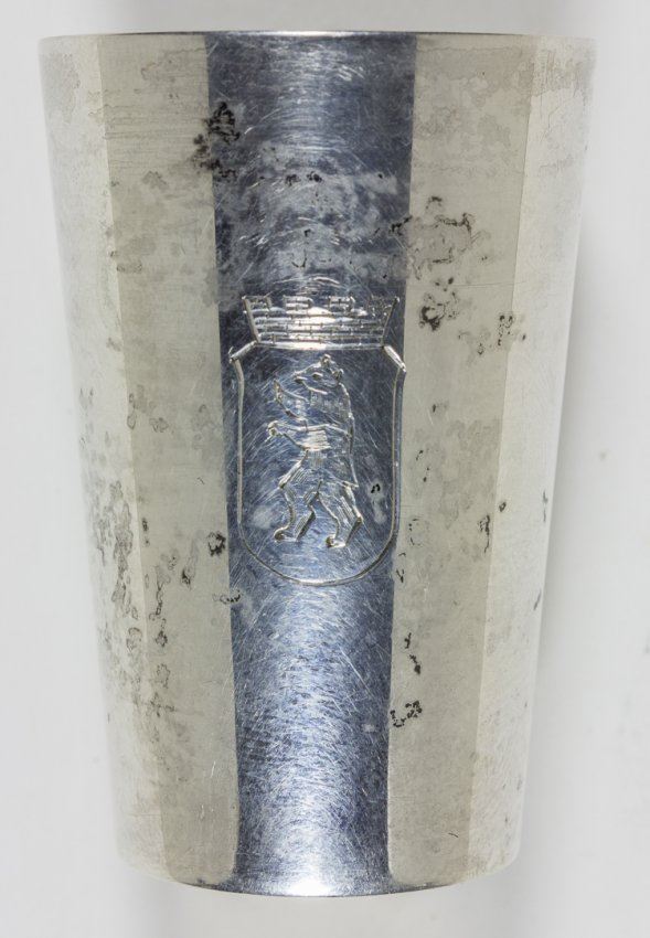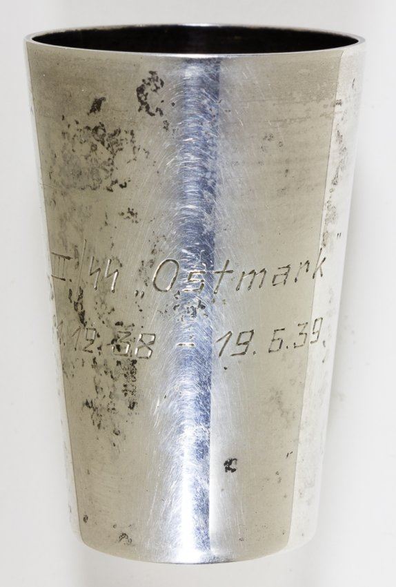 Small sterling silver schnapps cup, 2" tall, engraved with the Berlin "bear" emblem on one side, and on the opposite reading: "III. / SS "Ostmark,, 1. 12. 32 - 19. 6. 39" Some heavy tarnish removed to allow legibility, very good condition. "Ostmark" had been formed in Mauthausen in mid-1938, but in July III Sturmbann Gotze was detached to form the core of SS Heimwehr Danzig. This cup may have been a parting gift given to a member of that unit upon receipt of news of the transfer.