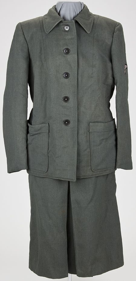 Excessively rare uniform of an SS-Aufseherin (prison matron), the gray-green wool jacket and skirt once owned by Ravenbruck dog-handler Gertrud Rabestein. The jacket bears a 3 1/4" cloth eagle insignia on the left sleeve, with no other insignia on the uniform, as is to be expected. Two exterior lined pockets are present, each 7" wide and 7 1/2" deep with 1 1/4" horizontal trim at top. This tunic of the "conservative" design, with modest lapels that would only open perhaps 5" below the neckline. Sleeves are 23 1/2" long, length is 25" in the back from the base of the collar. There are five brown buttons, each 7/8" diameter. Within, the garment bears a sewn-in elastic cinch at the waist, and is fully lined with green cloth and white and blue-striped cloth in the sleeves. The skirt is constructed of the same material as the jacket, about 30" at the waist, 27" long, with the proper pleat (17") at the front. A 7" "Zipp" steel zipper is sewn below a single button and tab closure. The skirt is not lined, as a shorter dress was often worn under this garment. All stitching, buttons, and insignia appear absolutuely original to the garment. Each item bears a 1 3/4" x 7/8" cloth identifying label reading: "SS-Aufseherin Gertrud Rabestein K.L. Ravensbruck". These labels bear soiling and wear absolutely consistent with the age of the garments, they are carefully sewn-in, and show absolutely so sign of having been "added" to the garments. Overall the jacket and skirt show only very slight wear. As both are constructed of rather heavy wool, we suspect this outfit was used only in cold weather. GERTRUD RABESTEIN (1903-1974) "The Commandeuse of Ravensbruck", joined the NSDAP in 1933. After employment at the women's prison in Naumberg, she spent a year as a guard at the women's concentration camp at Lichtenburg. In May, 1939 that camp was closed and its inmates (and Rabestein) were transferred to the newly-opened camp at Ravensbruck. While there she was charged with handling guard dogs which she often loosed on prisoners. She was also accused of beating, whipping and trampling her unfortunate captives. Rabestein particularly enjoyed depriving prisoners of warm clothing - if she found a sleeping prisoner with even a pair of socks, she would force the victim to spend eight hours in the freezing cold. In 1942, Rabestein requested that she be allowed to resign in order to return to Naumburg to accept a position as sergeant. She remained there until nearly the end of the war. On Aug. 31, 1948 Rabestein was arrested for her crimes, tried for the murder and mistreatment of concentration camp prisoners, and sentenced to life imprisonment.