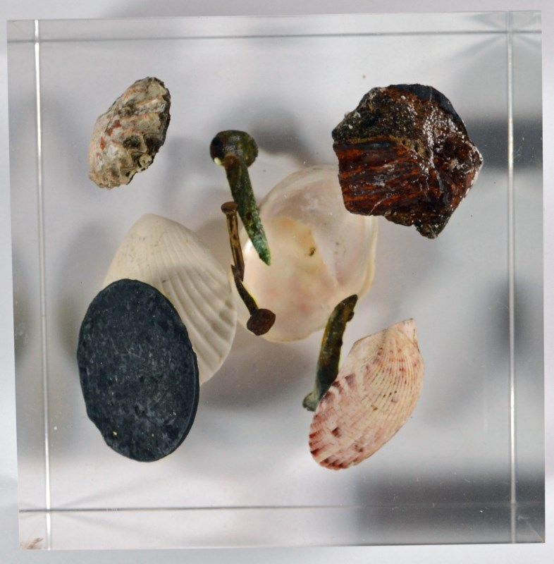 SSNY SHIPWECK COINS AND ARTIFACTS IN SOLID LUCITE DISPLAY, WITH COA AND STAND