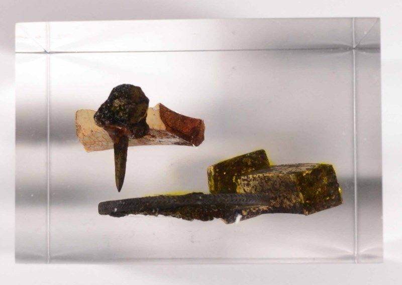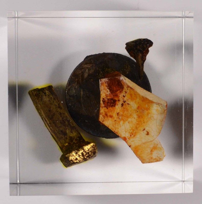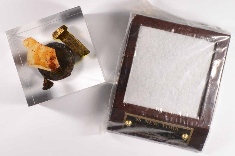 SSNY SHIPWECK COINS AND ARTIFACTS IN SOLID LUCITE DISPLAY, WITH COA AND STAND