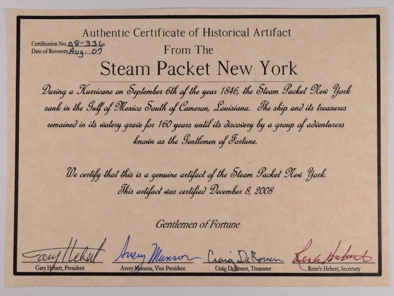 COMES WITH WRITTEN HISTORY OF THE SSNY SHIPWRECK IN 1846, COA SIGNED BY THE PEOPLE WHO FOUND THE WRECK! GREAT GIFT IDEA!!!ESTIMATE, $1000.00 TO $1100.00