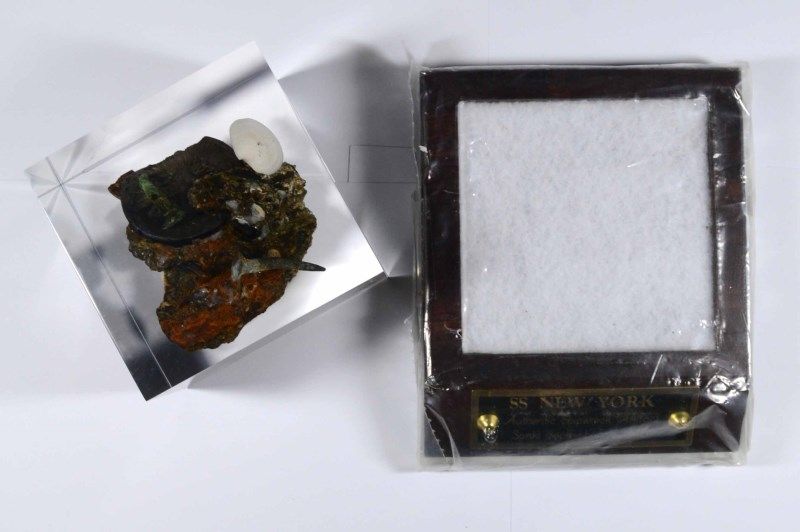 SSNY SHIPWECK COINS AND ARTIFACTS IN SOLID LUCITE DISPLAY, WITH COA AND STAND