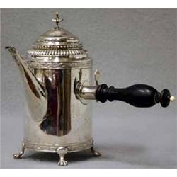 KAFFEKANNA, PÅ TASSFÖTTER, DEKOR AV BLADSLINGOR, BLOMKNOPP, UPPSVÄNGD PIP, RAKT SVÄRTAT TRÄSKAFT, PER GUSTAF STRÖMBERG, LINKÖPING 1811, H24